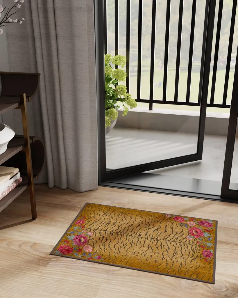 Inspired by Gracie's handpainted Tiger wallpaper, our Gracie Bengal Bloom Multicolor Rug features colorful floral motifs layered over a burnt orange tiger stripe pattern. A palette of magenta, red, berry, pink, indigo, and green pops beautifully against the charcoal stripes and gold highlights. Water-resistant, stain-resistant, and machine-washable. Rug colors may vary slightly according to your device and the lighting in your space.