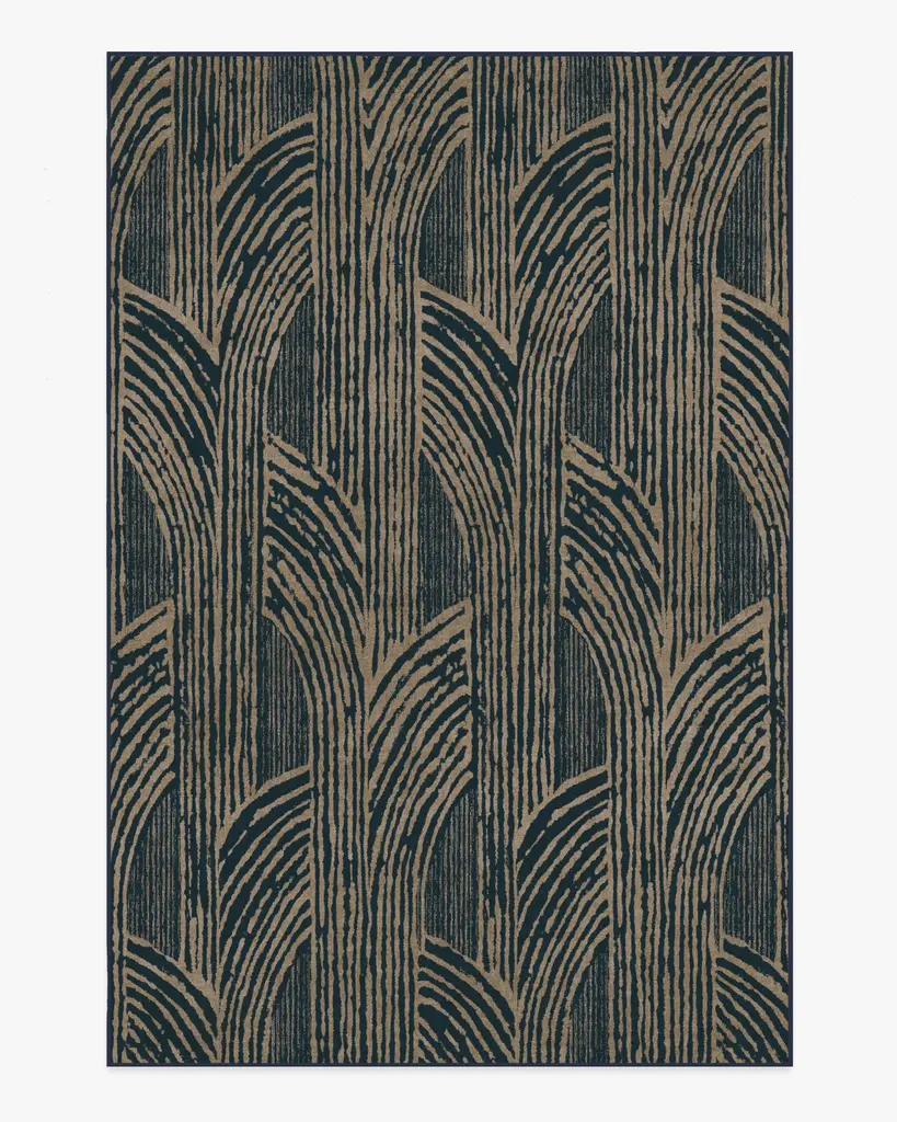 Unlock celebrity style with our Martyn Lawrence Bullard Beni Blue Rug. Featuring textural arches and irregular linework that create a dynamic, organic feel, this large-scale pattern makes a strong statement, combining soft curves with sharp edges. Light warm beige tones delicately stand out against a deep blue background, creating a balance of warmth and depth. Water-resistant, stain-resistant, and machine-washable. Rug colors may vary slightly according to your device and the lighting in your space.