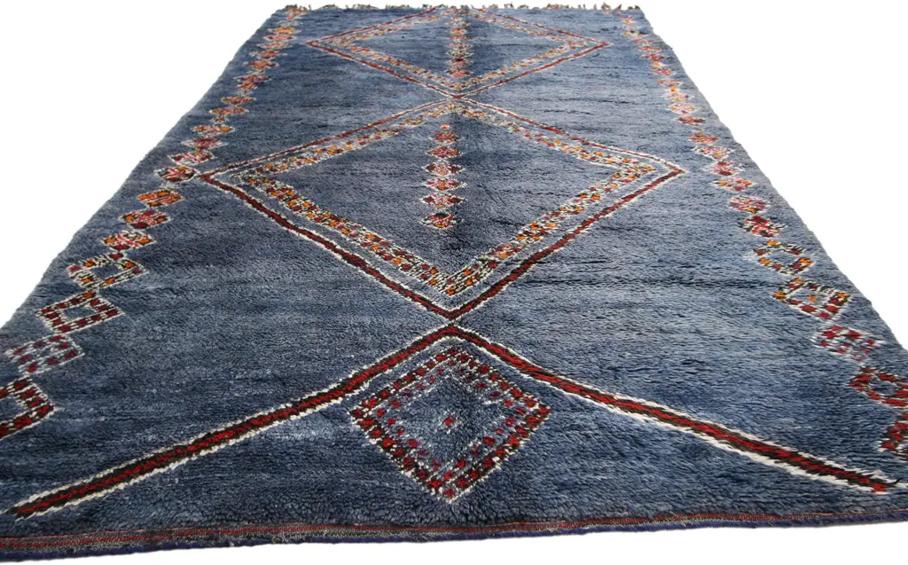 This hand-knotted wool vintage blue Beni M'Guild Moroccan rug features a geometric pattern composed of two stacked lozenge medallions flanked with a chevron and diamond motif at one end. Smaller diamond motifs highlight the inside of the two lozenge motifs and along the vertical sides of the composition. Though deceptively simple, this vintage Moroccan rug is clearly laced with meaning and cultural significance.