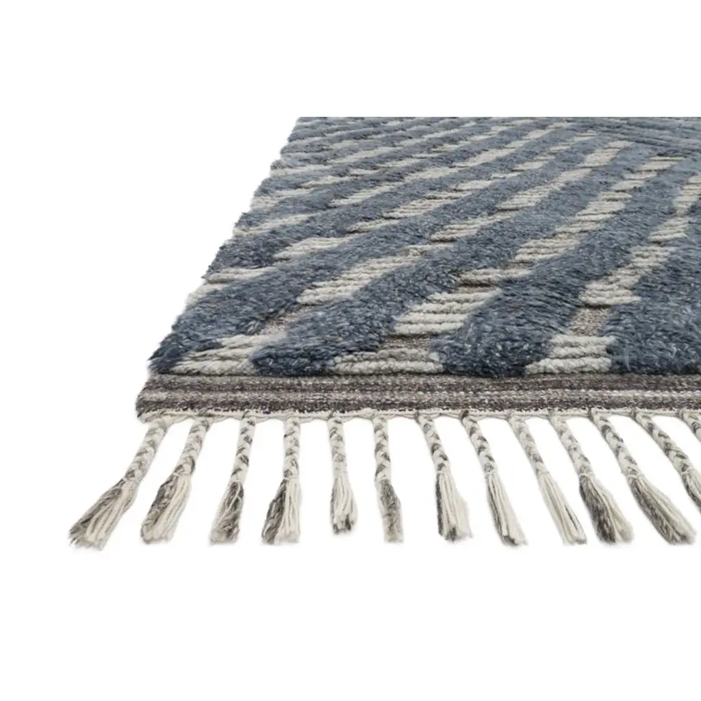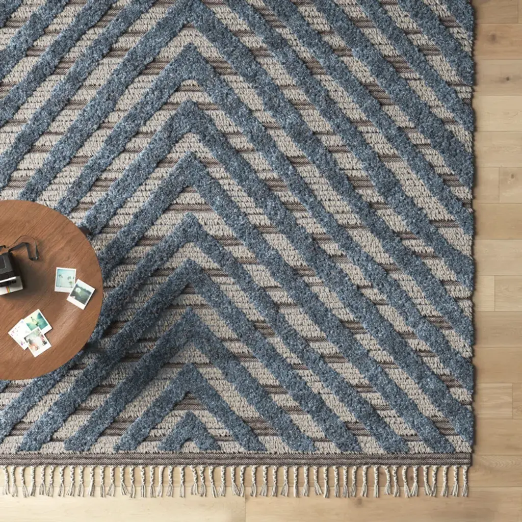 The right direction. This hand-knotted area rug brings a modern touch to your space with its repeating arrow pattern in blue and pewter hues. Crafted from a blend of wool and nylon, it features a 0.5" medium pile height that feels soft underfoot. The natural, undyed materials give each rug its unique character, while the thoughtfully designed fringe adds a stylish finishing touch. This rug is floor heating safe and stain-resistant, making it a great choice for high-traffic areas. Just remember to pair it with a rug pad to keep it in place and add extra cushioning.