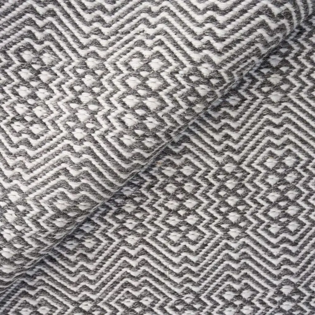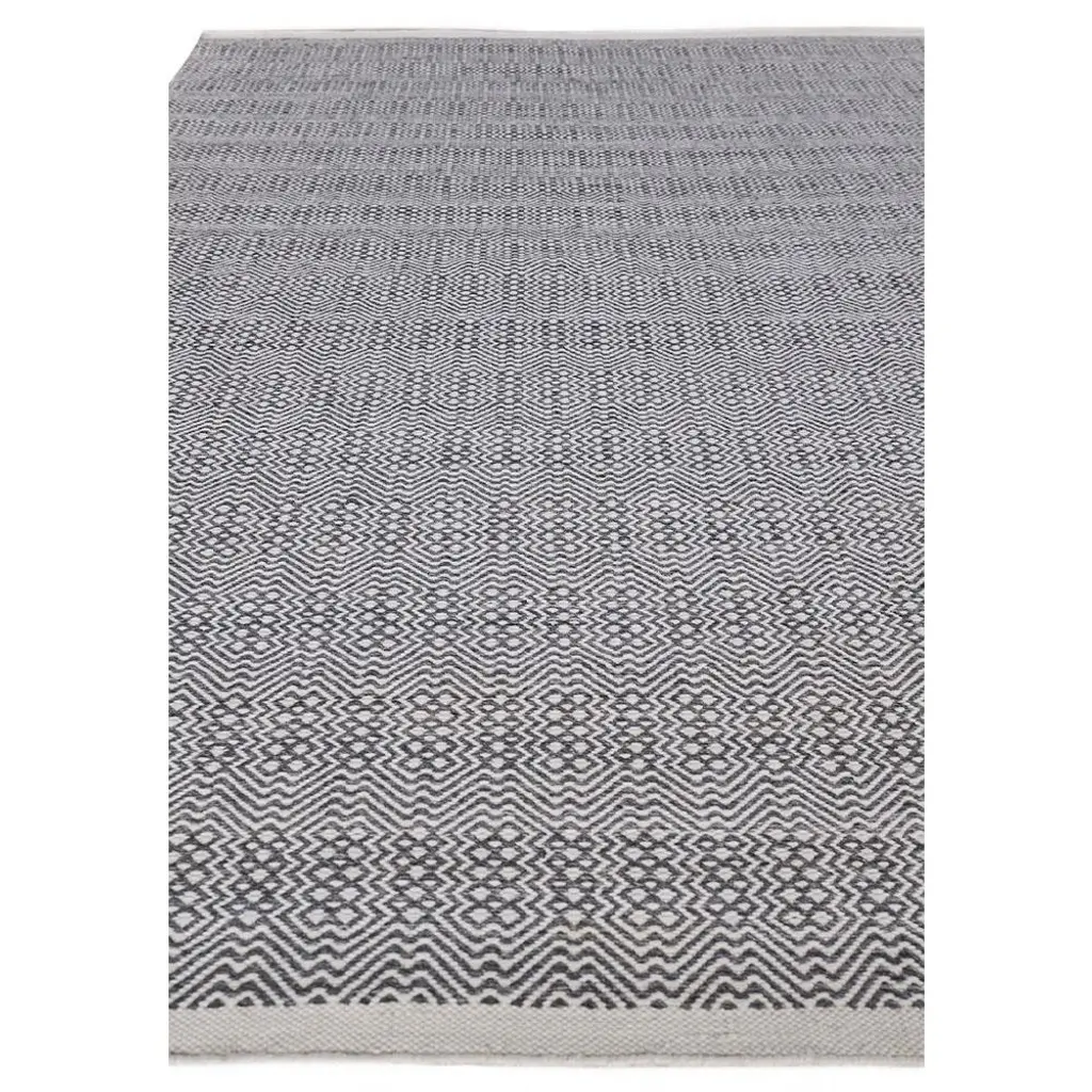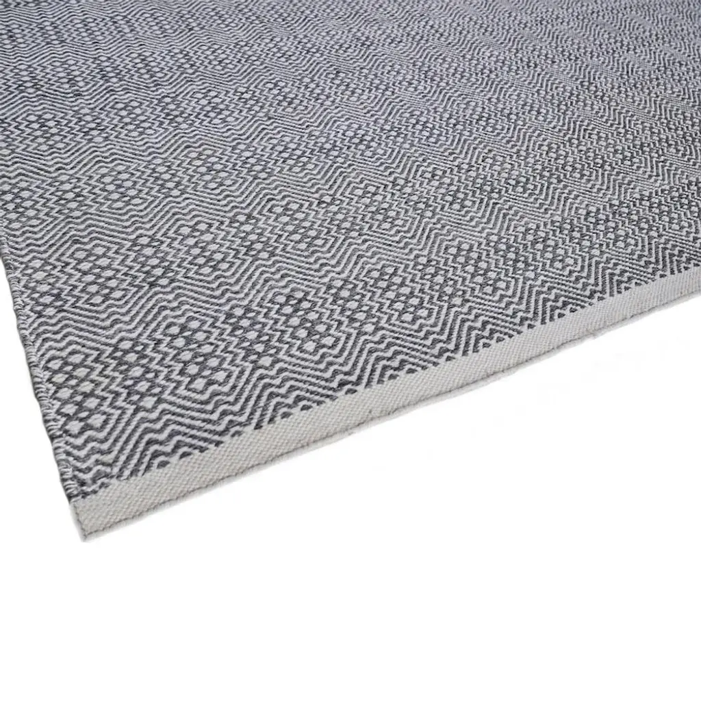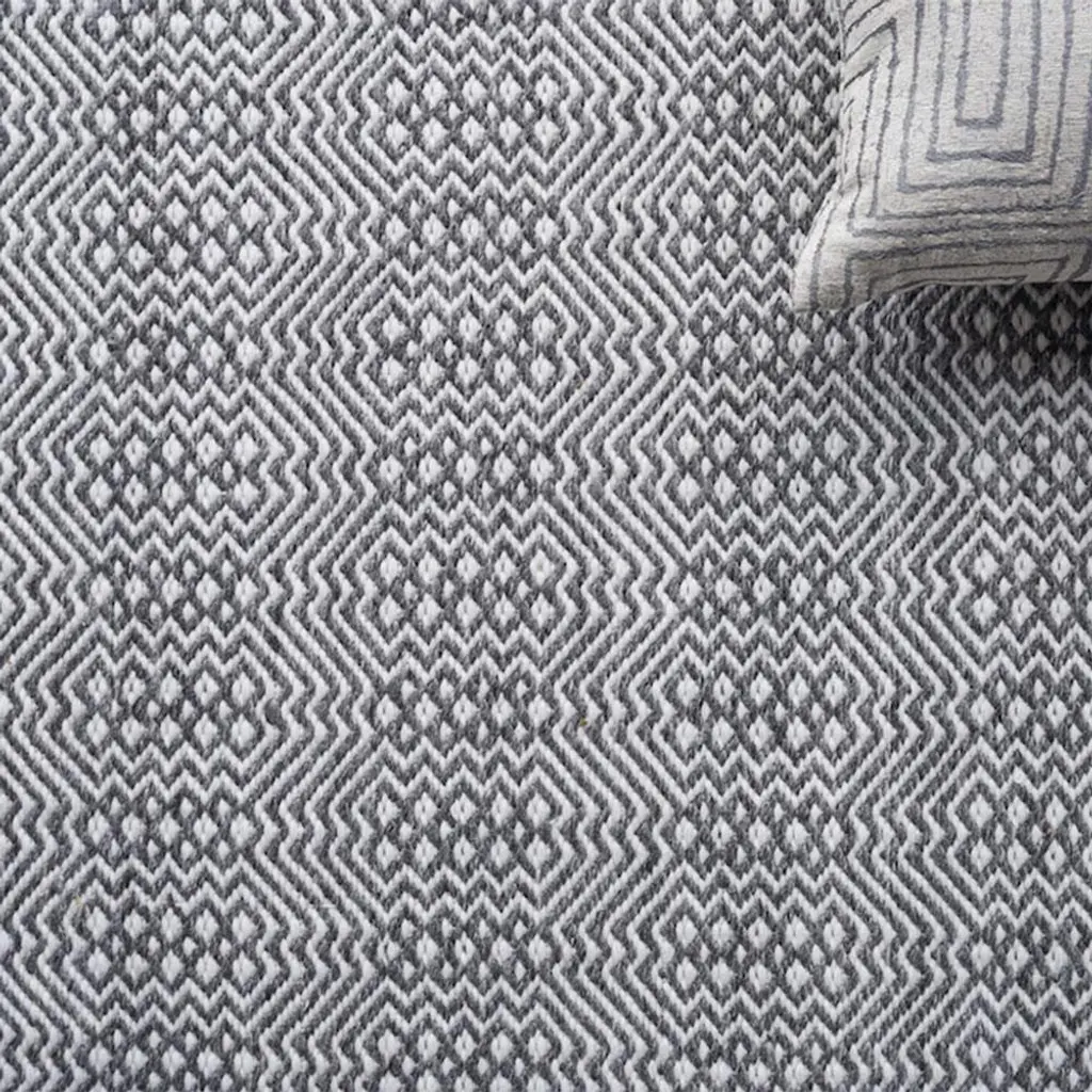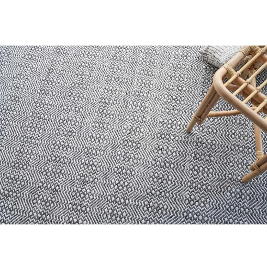 Rug swatch available! To order, choose SAMPLE in the size drop-down.The classic diamond shape is reinvented in a lively motif on the 8'x10' Bennett rug. Bold and modern, the small-scale pattern is finished in timeless shades of grey and ivory. Handcrafted from durable performance PET fibers, this effortlessly livable rug is an easy choice for your indoor or outdoor living space.