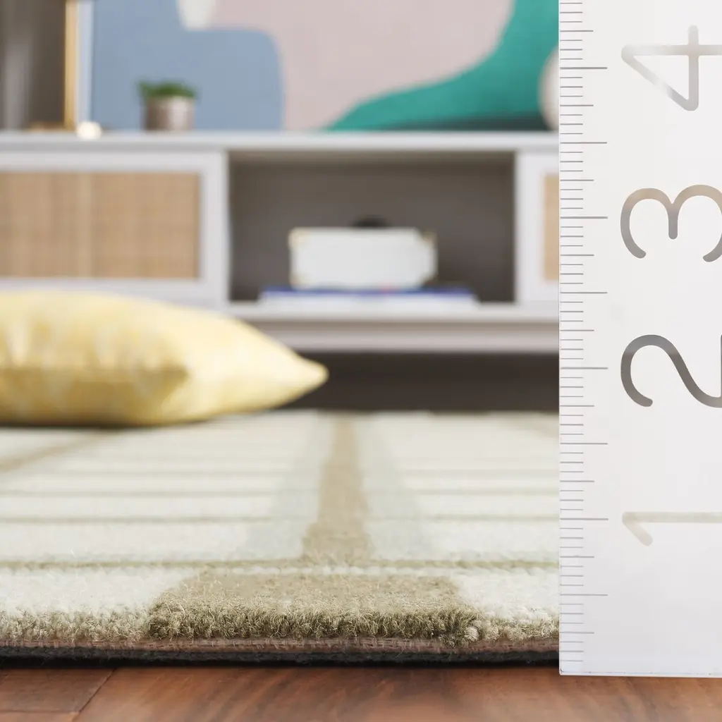 Introducing our exquisite 3' x 5' small rectangle area rug, a perfect blend of sophistication and comfort. Handcrafted with the utmost precision, this rug is hand tufted with a lush pile height of 1/2'', offering a soft underfoot experience. The high-quality construction boasts an 80% wool and 20% cotton composition, ensuring durability and a gentle touch. The modern design features a geometric pattern of green and ivory squares, set in an elegant grid that provides a visually striking foundation for any room. The green borders add definition to the clean ivory squares, invoking a sense of balance and contemporary charm. Proudly made in India, this rug embodies exceptional craftsmanship and a unique style that will enhance your living space. Ideal for adding a touch of modern flair, this rug is not just a decorative piece but also a testament to masterful design and quality materials. Elevate your home decor with this luxurious and stylish area rug.