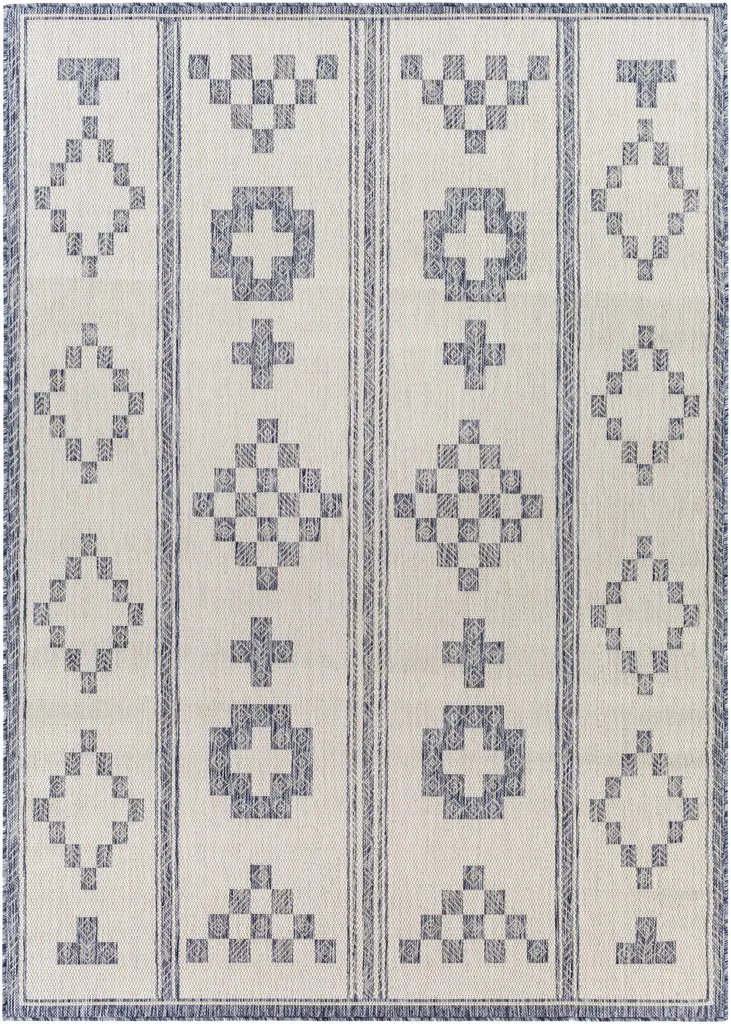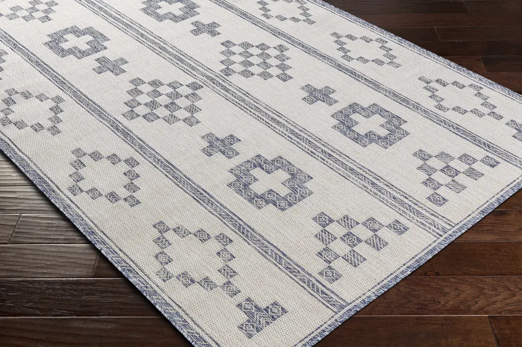 Collection: Besao Colors: Blue, Navy, Off White, Pale Blue, Tan, Taupe Construction: Machine Woven Material: 100% Polypropylene Pile: No Pile Styles: Transitional,Bohemian Outdoor Safe: Yes Made In: Turkey Thickness: 0.16" Price Range: $$$$$ (Most Affordable)