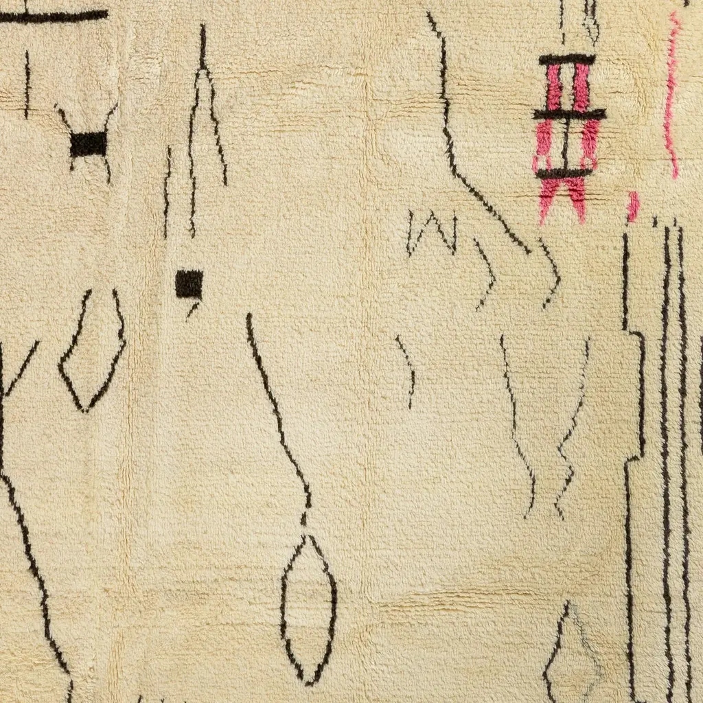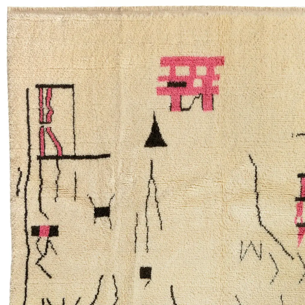 This contemporary hand knotted Tulu rug blends the time-honored traditions of Anatolian weaving with a fresh, modern sensibility. Made from 100% hand-spun wool, the rug features a soft cream ground enlivened by bold abstract linework in black, accented with playful pops of pink. The design recalls mid-century Moroccan Berber rugs, yet feels distinctly modern with its spontaneous geometric and symbolic forms that resemble abstract art sketches.With its thick, shaggy pile (available in low pile as well), this rug provides both comfort and warmth, making it ideal as a statement floor covering, a cozy lounge accent, or even a striking wall hanging. Its minimalist palette with a touch of color allows it to adapt effortlessly to interiors ranging from Scandinavian and bohemian to eclectic and modernist spaces.Measuring approximately 8x10 ft, this piece is one of a kind, but it can also be custom produced in different sizes, colors, and proportions within 3–5 weeks, offering flexibility for interior designers and collectors alike. Its fusion of heritage craftsmanship and contemporary design makes it not only a functional rug but also a collectible work of textile art.
