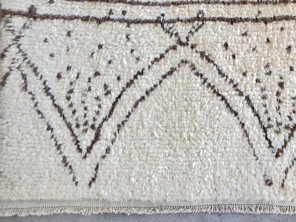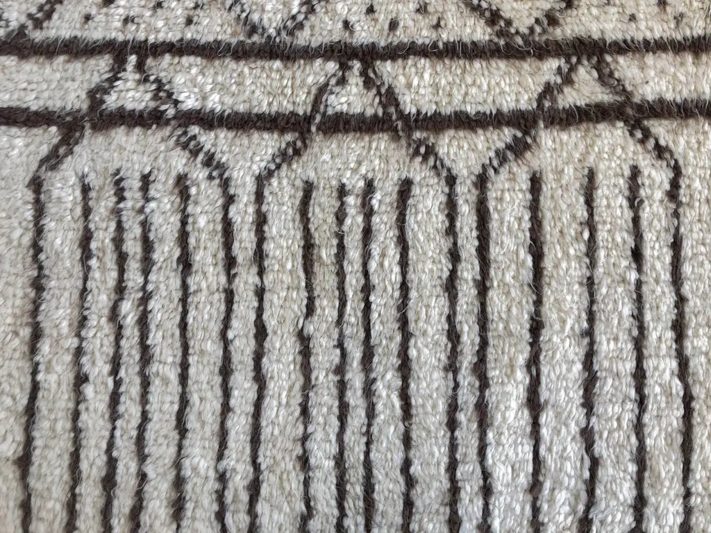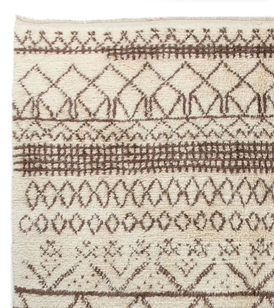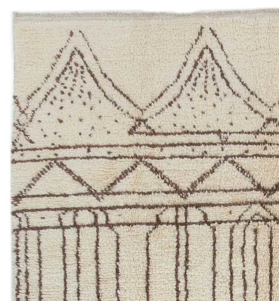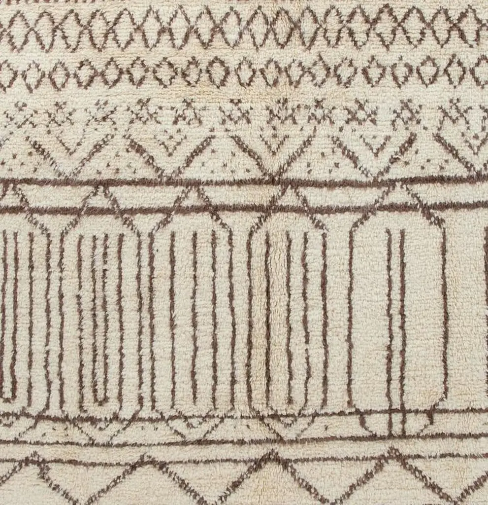 This hand-knotted Moroccan wool rug features a visually rich ivory field accented by intricate brown linear and geometric tribal motifs. Multiple rows of diamonds, zigzags, and vertical bands form an ornamental tapestry of patterns, giving the rug a rhythmic, almost architectural presence.Woven from 100% natural wool, this rug has a dense, plush pile that feels warm and luxurious underfoot while offering long-lasting durability. The design references Berber weaving traditions, but its structured geometry and layered bands of pattern lend it a distinctly modern edge.Its neutral ivory-and-brown palette makes it highly versatile, suited for Scandinavian, mid-century, minimalist, eclectic, and bohemian interiors. This rug works beautifully as a statement piece in living rooms or dining spaces, while also functioning as a subtle, grounding textile in more layered interiors.Details•Hand-knotted from 100% natural wool•Ivory background with brown tribal linear and geometric motifs•Dense, plush pile with natural warmth and sheen•Inspired by Moroccan Berber heritage, reinterpreted with modern geometry•One-of-a-kind artisan weaving•Excellent conditionCustom production in alternative sizes and colorways may be available for interior designers and bespoke projects.