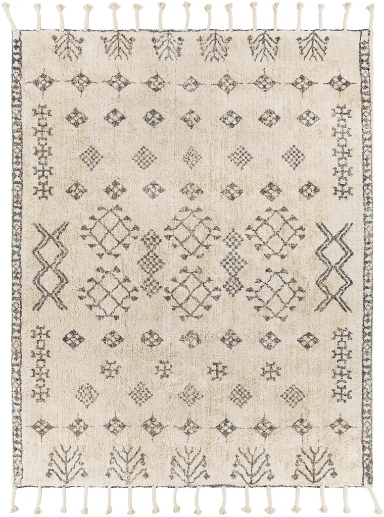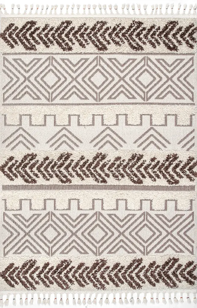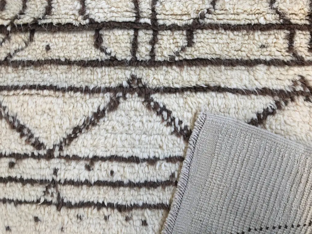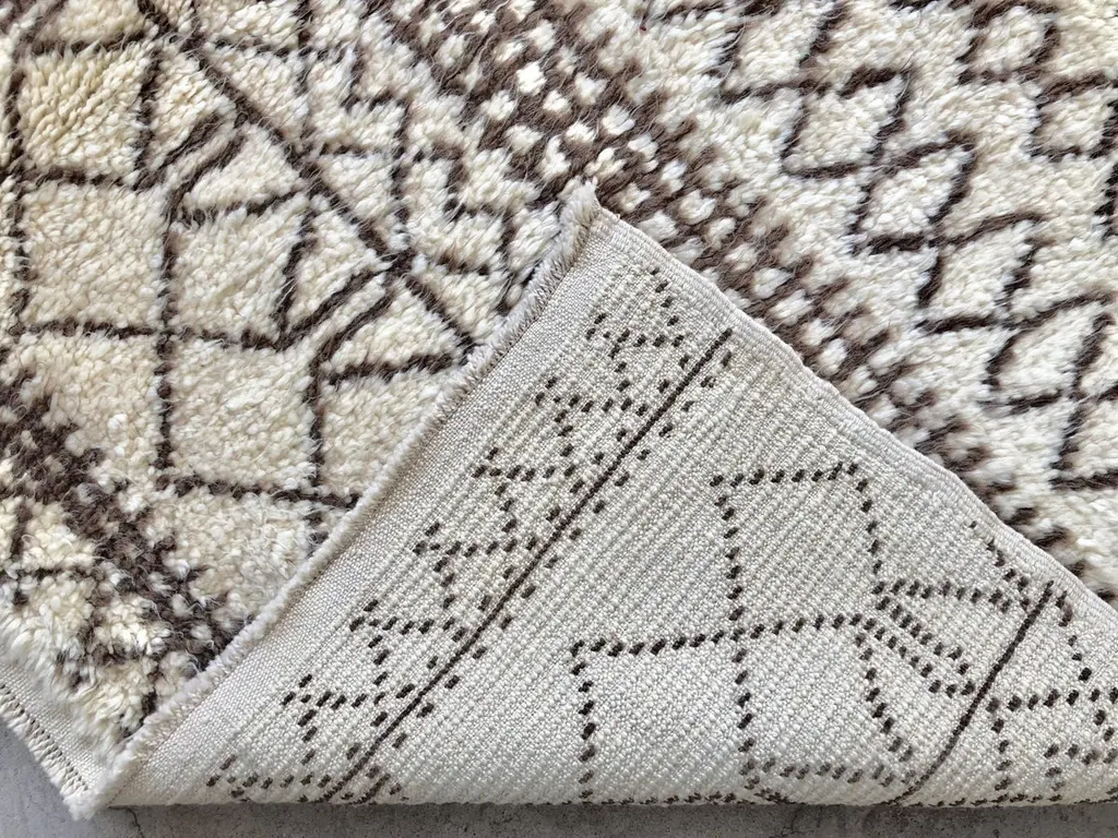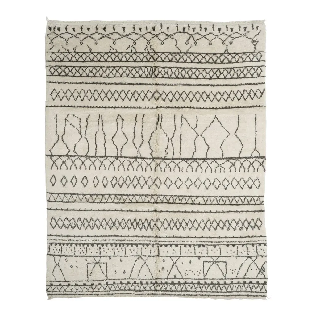This hand-knotted Moroccan wool rug features a visually rich ivory field accented by intricate brown linear and geometric tribal motifs. Multiple rows of diamonds, zigzags, and vertical bands form an ornamental tapestry of patterns, giving the rug a rhythmic, almost architectural presence.Woven from 100% natural wool, this rug has a dense, plush pile that feels warm and luxurious underfoot while offering long-lasting durability. The design references Berber weaving traditions, but its structured geometry and layered bands of pattern lend it a distinctly modern edge.Its neutral ivory-and-brown palette makes it highly versatile, suited for Scandinavian, mid-century, minimalist, eclectic, and bohemian interiors. This rug works beautifully as a statement piece in living rooms or dining spaces, while also functioning as a subtle, grounding textile in more layered interiors.Details•Hand-knotted from 100% natural wool•Ivory background with brown tribal linear and geometric motifs•Dense, plush pile with natural warmth and sheen•Inspired by Moroccan Berber heritage, reinterpreted with modern geometry•One-of-a-kind artisan weaving•Excellent conditionCustom production in alternative sizes and colorways may be available for interior designers and bespoke projects.