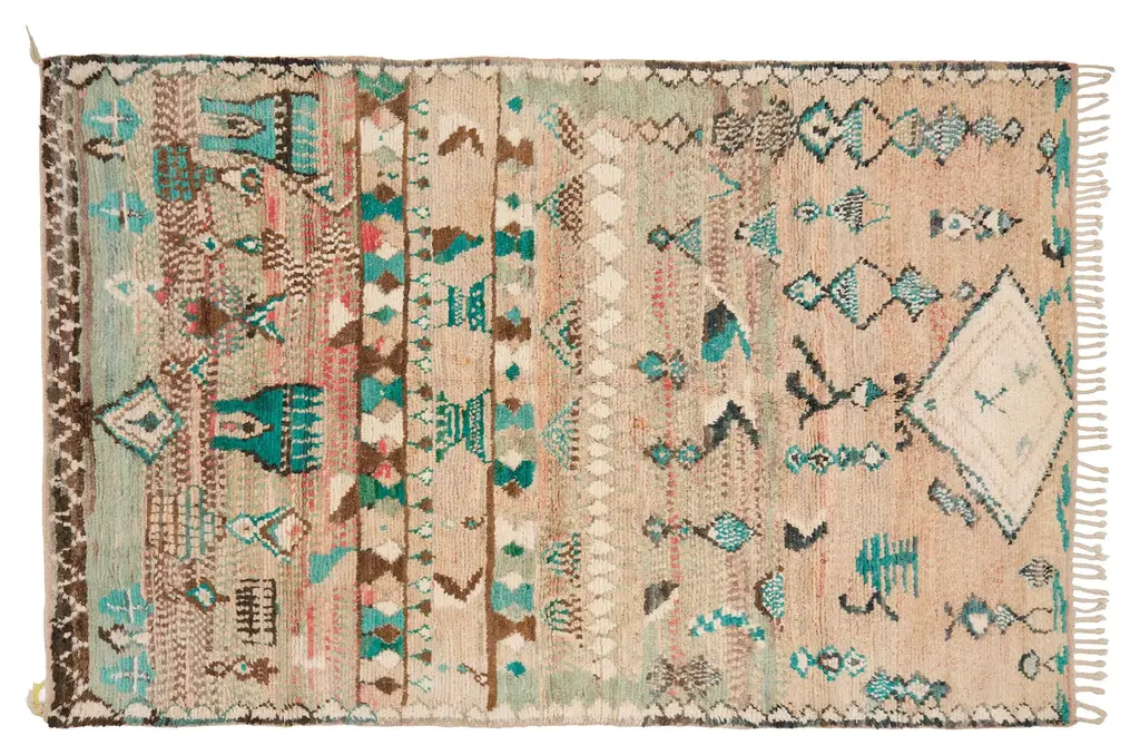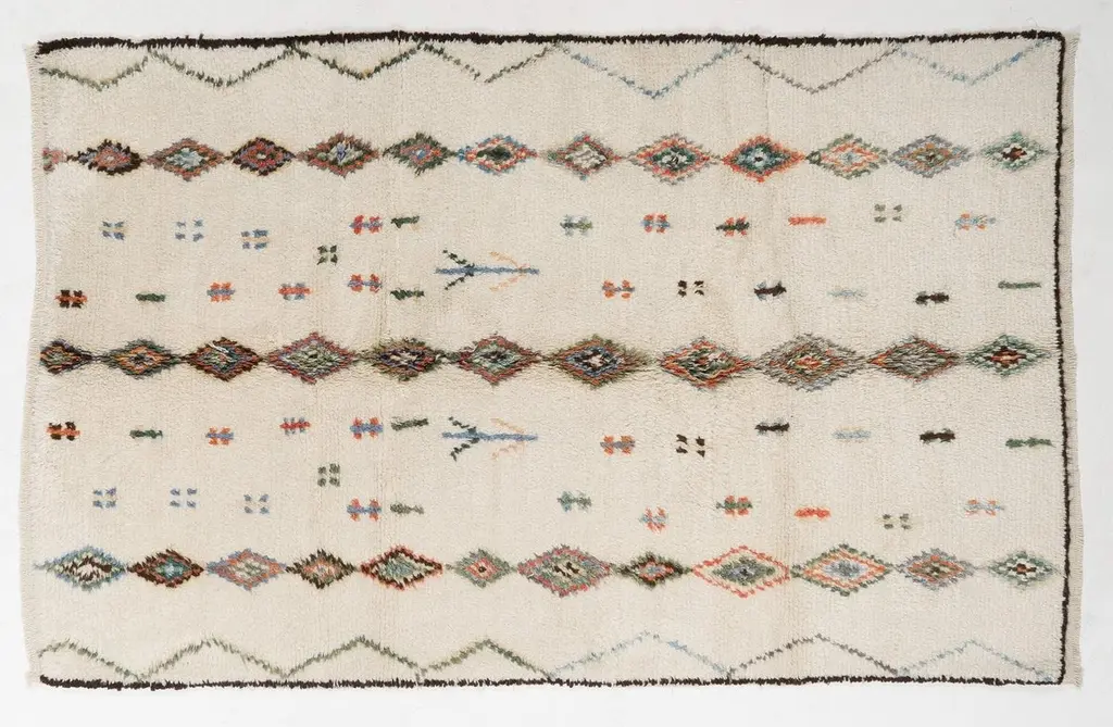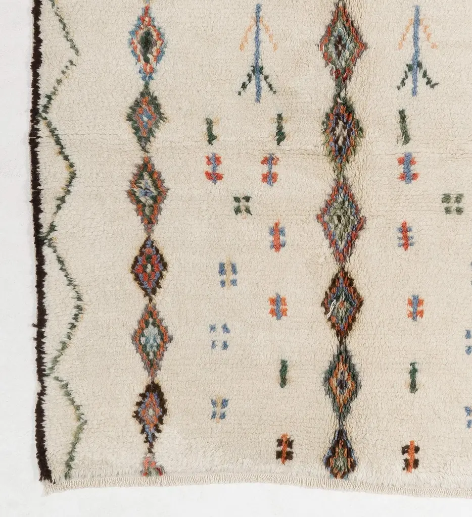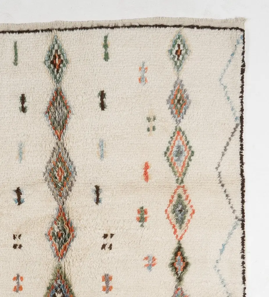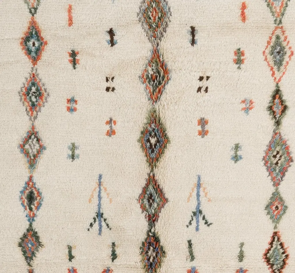 This hand-knotted Moroccan Beni Ourain rug is crafted from 100% natural wool and features an elegant ivory ground highlighted with colorful tribal motifs. The vertical rows of multicolored diamond medallions and small symbolic accents bring a touch of vibrancy and authenticity to its timeless design.The rug’s plush wool pile makes it soft and inviting underfoot, while the lively use of green, blue, orange, and earthy tones creates visual interest without overwhelming the space. Perfect for modern, eclectic, bohemian, or mid-century interiors, this piece offers both comfort and character.Whether used as a living room centerpiece, bedroom accent, or design project statement rug, it brings together traditional Moroccan artistry with a look that feels fresh and contemporary.Details•Hand-knotted in Morocco•100% natural wool•Ivory ground with multicolor tribal diamond motifs•Plush, medium pile for softness and warmth•Inspired by Berber Beni Ourain traditions•One-of-a-kind, artisan-made rug•Custom sizes and colorways available on request