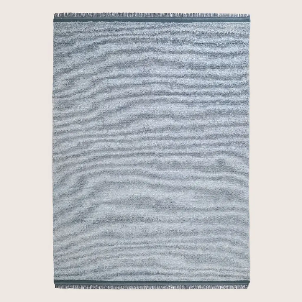 Go barefoot. This hand-knotted rug’s textured surface is pure softness. A subtle stripe and fringed edge add just-enough detail, while 100% RWS-certified wool wears beautifully over time.