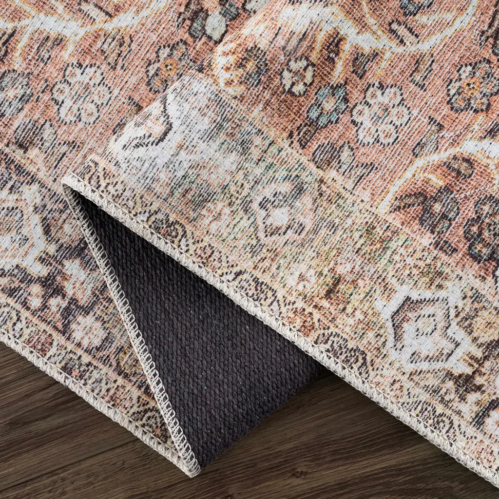 Brand: Hauteloom Collection: Bian Colors: Peach, Pink, Mustard, Aqua, Beige, Blue, Brown, Off White, Charcoal Construction: Machine Printed Material: 100% Polyester Pile: Low Pile Pile Height: 0.16" Styles: Traditional Backing: Cotton Machine Washable: Yes Made In: Turkey Thickness: 0.2" Price Range: $$$$$ (Most Affordable)