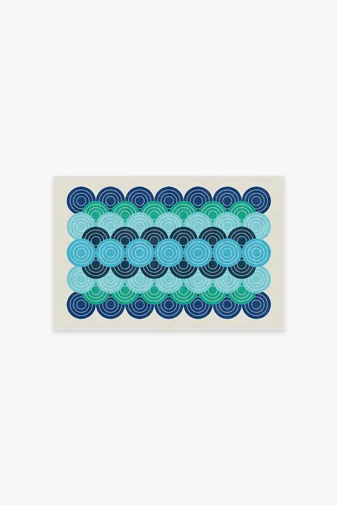 Mod and evocative of disco divas of yore. This graphic rug features layered rows of circles in a vibrant color palette of royal blue, turquoise green, cerulean, and deep navy blue on an off-white background. Water-resistant, stain-resistant, and machine-washable.