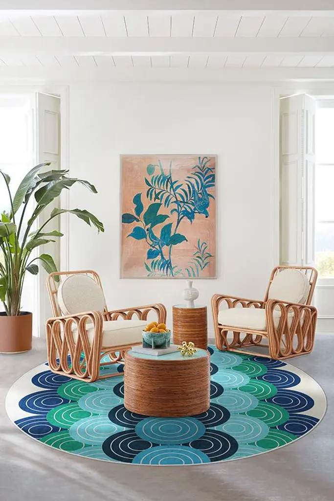 Mod and evocative of disco divas of yore. This graphic rug features layered rows of circles in a vibrant color palette of royal blue, turquoise green, cerulean, and deep navy blue on an off-white background. Water-resistant, stain-resistant, and machine-washable.