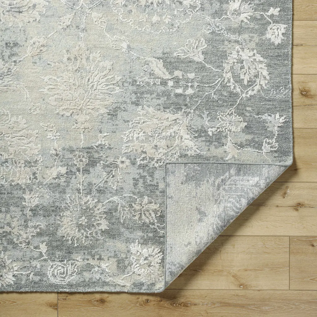 Collection: Binonga Colors: Charcoal, Light Gray, Taupe, Tan, Peach Construction: Hand Knotted Material: 70% Wool, 30% Viscose Pile: High Pile Pile Height: 0.98" Styles: Traditional Made In: India Thickness: 1.18" Price Range: $$$$$ (Premium)