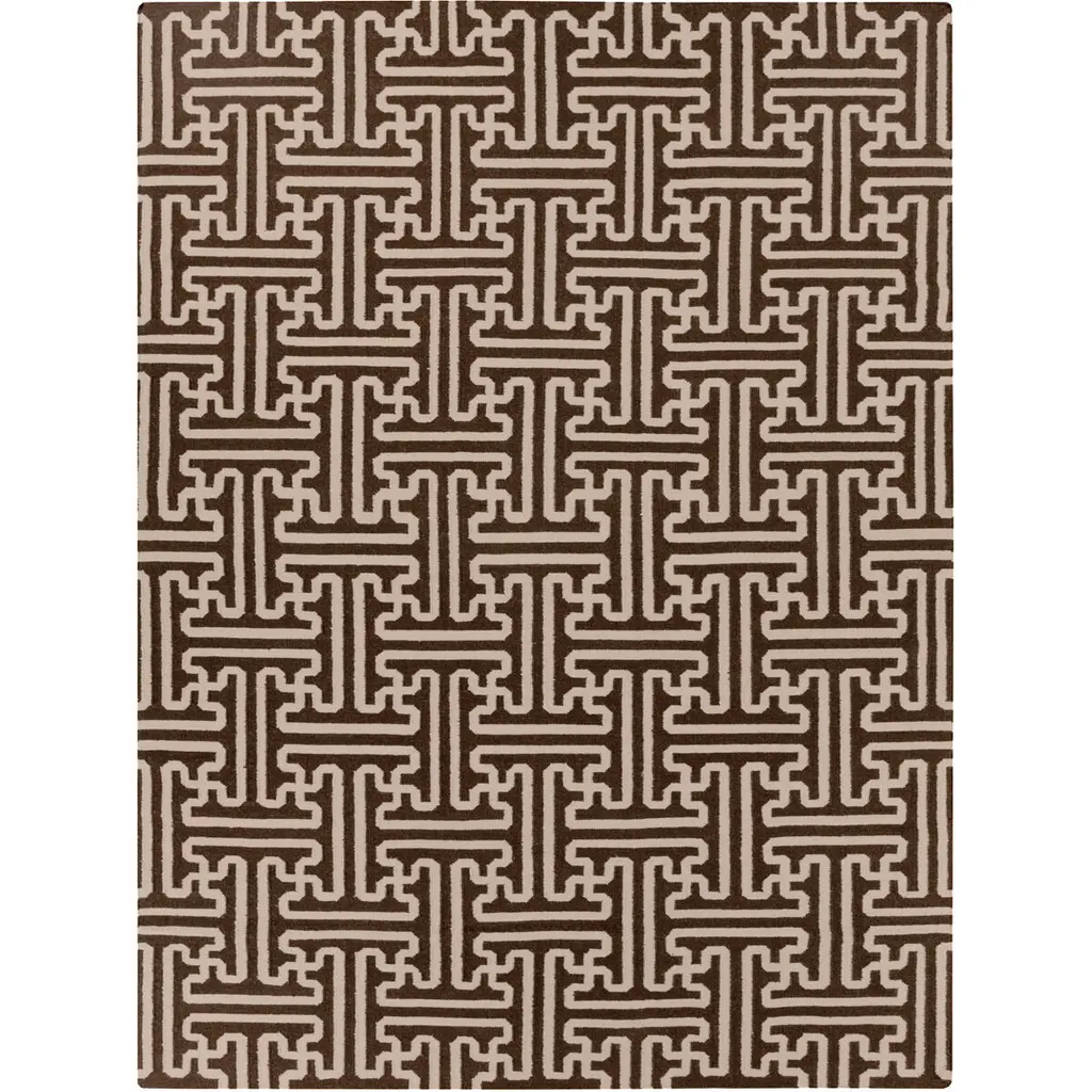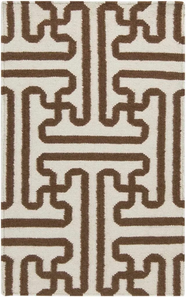 Collection: Bippus Colors: Dark Brown, Ivory Construction: Hand Woven Material: 100% Wool Pile: No Pile Styles: Transitional Made In: India Thickness: 0.16" Price Range: $$$$$ (Affordable)