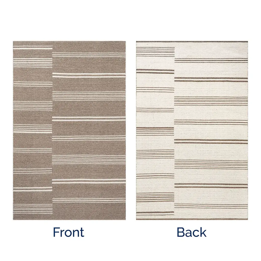 Handcrafted of soft, durable wool, this striped rug offers two looks in one. While one side features white stripes on a darker background, the reverse displays darker stripes on a pale background. A rug pad is recommended to help prevent slipping.