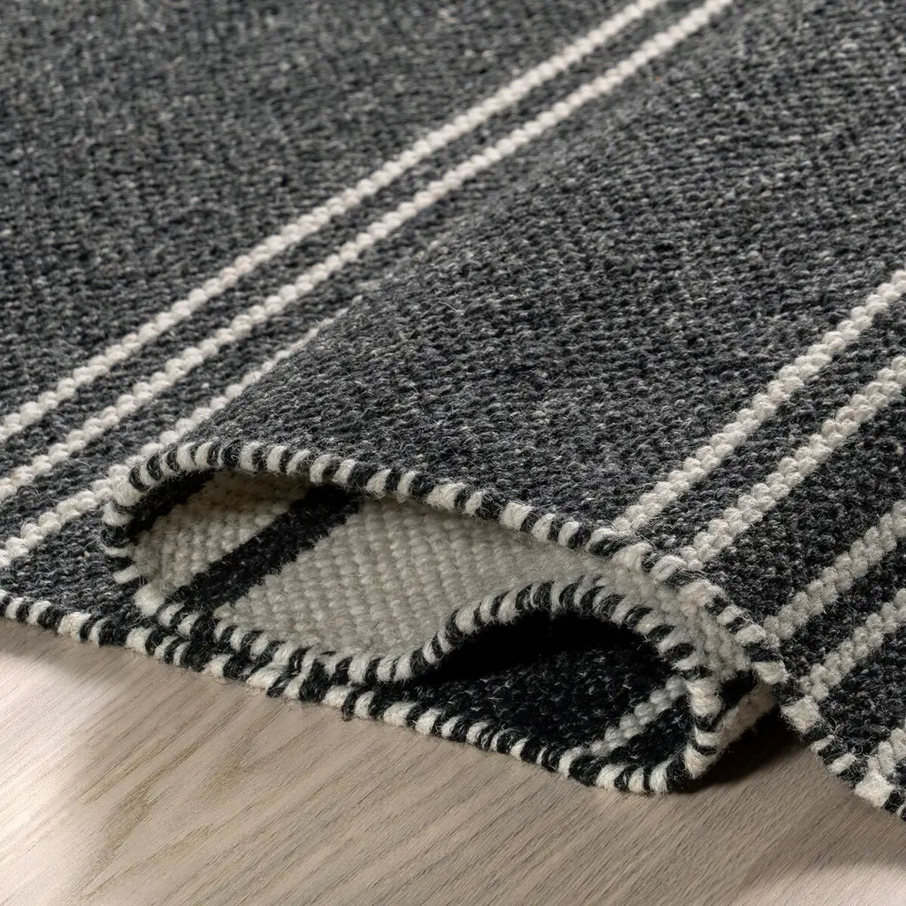 Handcrafted of soft, durable wool, this striped rug offers two looks in one. While one side features white stripes on a darker background, the reverse displays darker stripes on a pale background. A rug pad is recommended to help prevent slipping.
