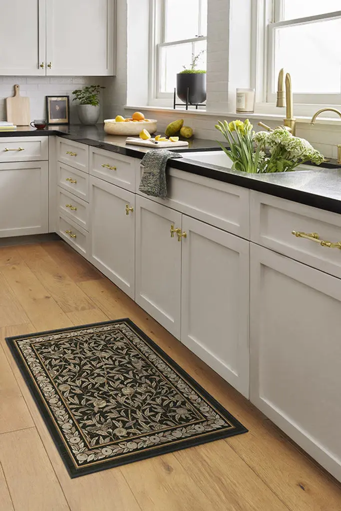 Let your room sing with our Morris & Co. Bird & Pomegranate Soft Black Rug. We've transformed the 1926 wallpaper design into a charming vignette with a modern, playful border. Originally inspired by views from William Morris's personal home, this whimsical scene features birds swooping, perching, and pecking amidst a maze of pomegranate plants. The composition features moody contrasted black, browns, gold and desaturated neutrals for a more subdued feel. Water-resistant, stain-resistant, and machine-washable. Rug colors may vary slightly according to your device and the lighting in your space.