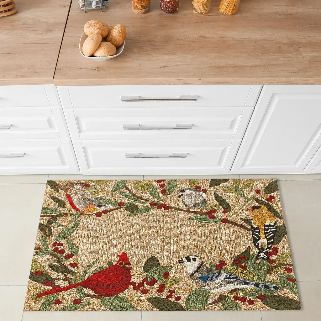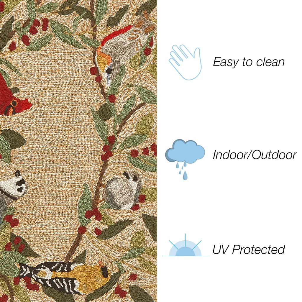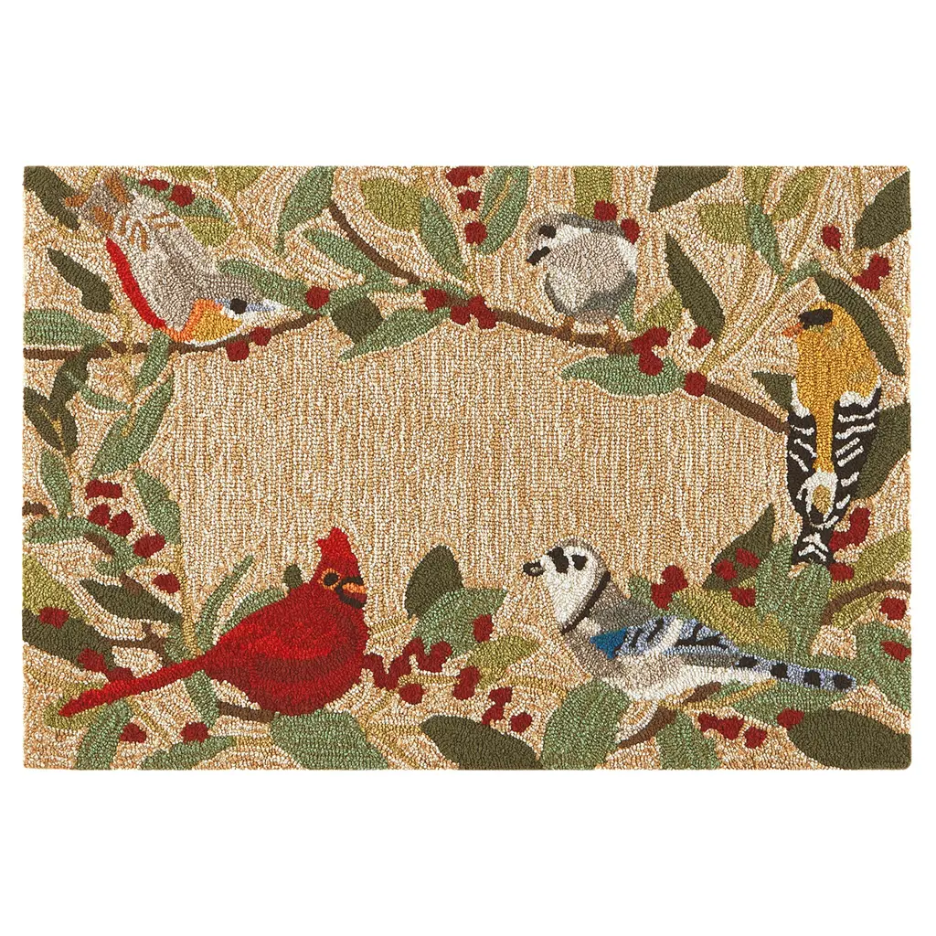 his Indoor/Outdoor Synthetic Blend Birds Border Rug has the beauty and softness of a traditional pile rug, but it's made of polyester and acrylic to stand up to high traffic indoors and out. The whimsical design of familiar backyard birds amid branches laden with leaves and berries adds a delightful touch of outdoor style at any time of year.This handsome rug is versatile, colorful and functional. Durable enough to withstand heavy traffic, kids and pets, it's perfect for any area: porch, patio, sun room, kitchen and more. Hose clean.Pattern varies slightly by size. Rug pile is approx. ¼"H. Sizes are approximate. Imported.