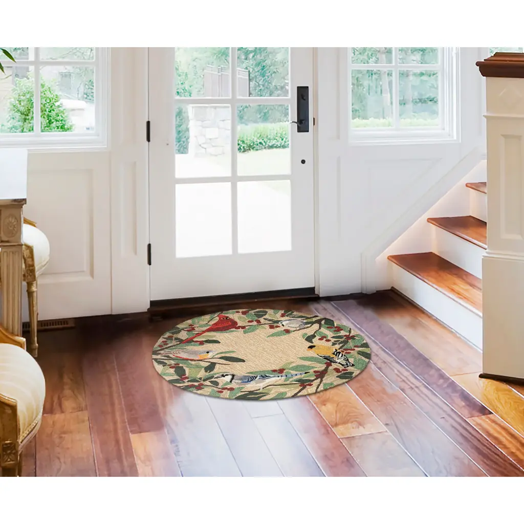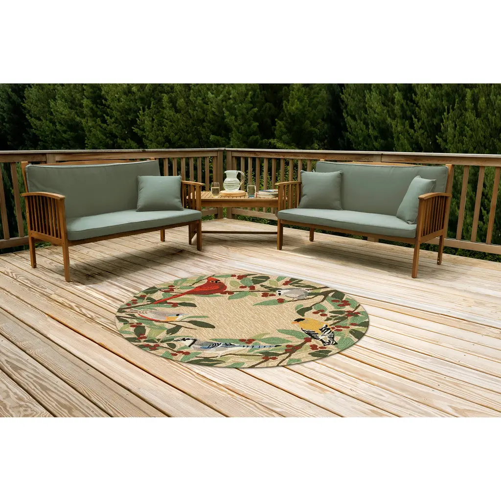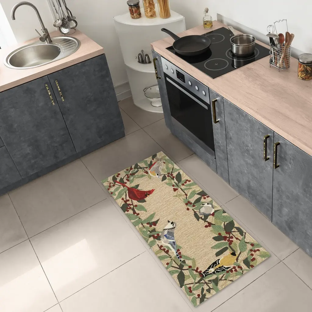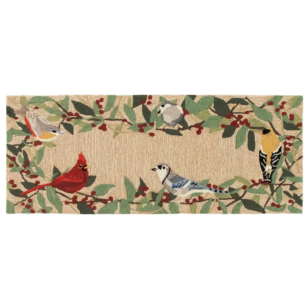his Indoor/Outdoor Synthetic Blend Birds Border Rug has the beauty and softness of a traditional pile rug, but it's made of polyester and acrylic to stand up to high traffic indoors and out. The whimsical design of familiar backyard birds amid branches laden with leaves and berries adds a delightful touch of outdoor style at any time of year.This handsome rug is versatile, colorful and functional. Durable enough to withstand heavy traffic, kids and pets, it's perfect for any area: porch, patio, sun room, kitchen and more. Hose clean.Pattern varies slightly by size. Rug pile is approx. ¼"H. Sizes are approximate. Imported.