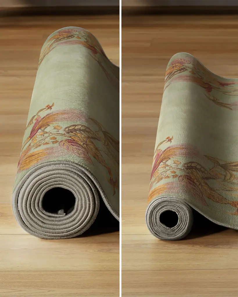 Welcome whimsy with our Sanderson Bird of Paradise Silver Fern Rug. Inspired by Sanderson's Bird of Paradise pattern, this design features motifs of birds, orchids, foliage, and feathers that evolve into an organic border. The palette beautifully blends shades of magenta, pink, green, yellow, and brown against a subtle gradient sage background. Water-resistant, stain-resistant, and machine-washable. Rug colors may vary slightly according to your device and the lighting in your space.