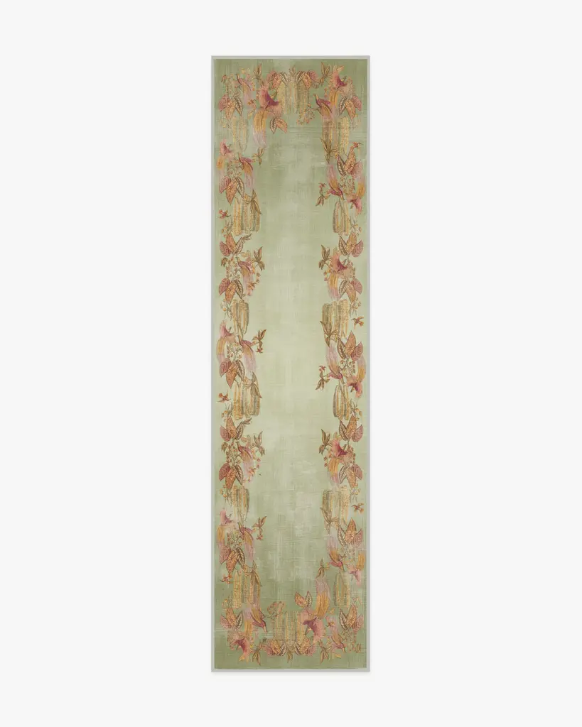 Welcome whimsy with our Sanderson Bird of Paradise Silver Fern Rug. Inspired by Sanderson's Bird of Paradise pattern, this design features motifs of birds, orchids, foliage, and feathers that evolve into an organic border. The palette beautifully blends shades of magenta, pink, green, yellow, and brown against a subtle gradient sage background. Water-resistant, stain-resistant, and machine-washable. Rug colors may vary slightly according to your device and the lighting in your space.