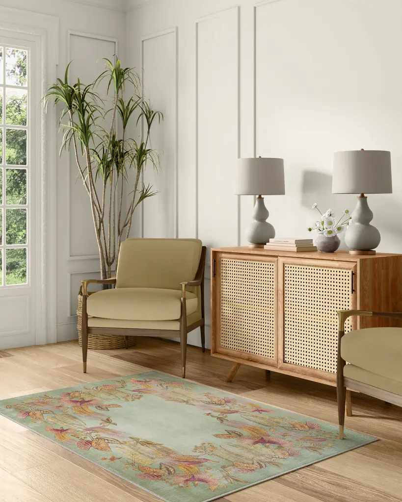 Welcome whimsy with our Sanderson Bird of Paradise Silver Fern Rug. Inspired by Sanderson's Bird of Paradise pattern, this design features motifs of birds, orchids, foliage, and feathers that evolve into an organic border. The palette beautifully blends shades of magenta, pink, green, yellow, and brown against a subtle gradient sage background. Water-resistant, stain-resistant, and machine-washable. Rug colors may vary slightly according to your device and the lighting in your space.