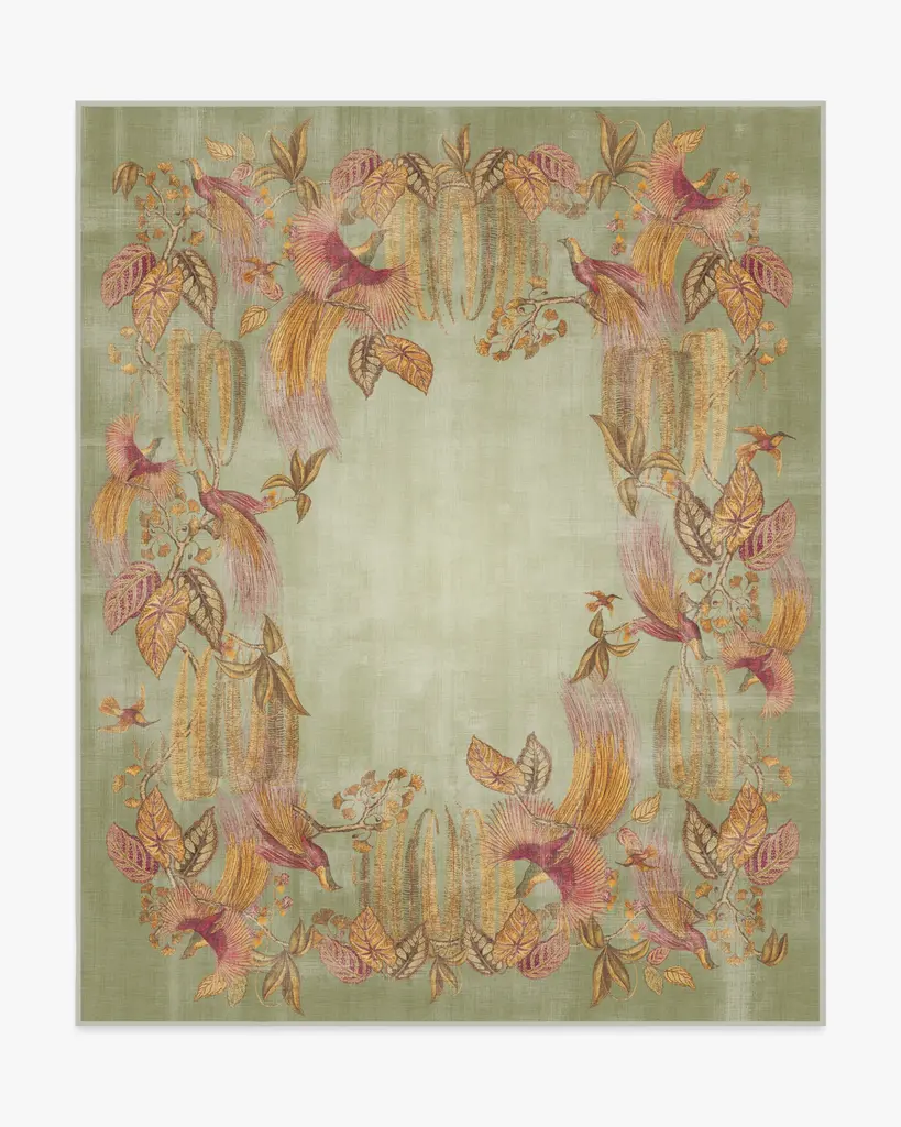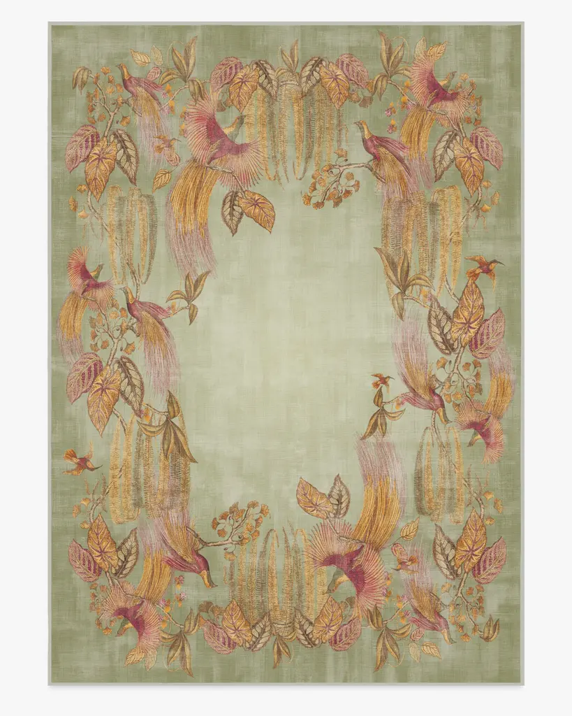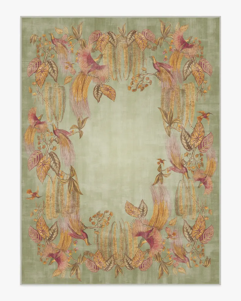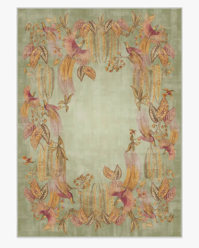 Welcome whimsy with our Sanderson Bird of Paradise Silver Fern Rug. Inspired by Sanderson's Bird of Paradise pattern, this design features motifs of birds, orchids, foliage, and feathers that evolve into an organic border. The palette beautifully blends shades of magenta, pink, green, yellow, and brown against a subtle gradient sage background. Water-resistant, stain-resistant, and machine-washable. Rug colors may vary slightly according to your device and the lighting in your space.