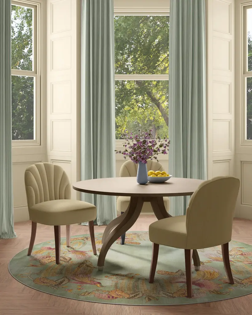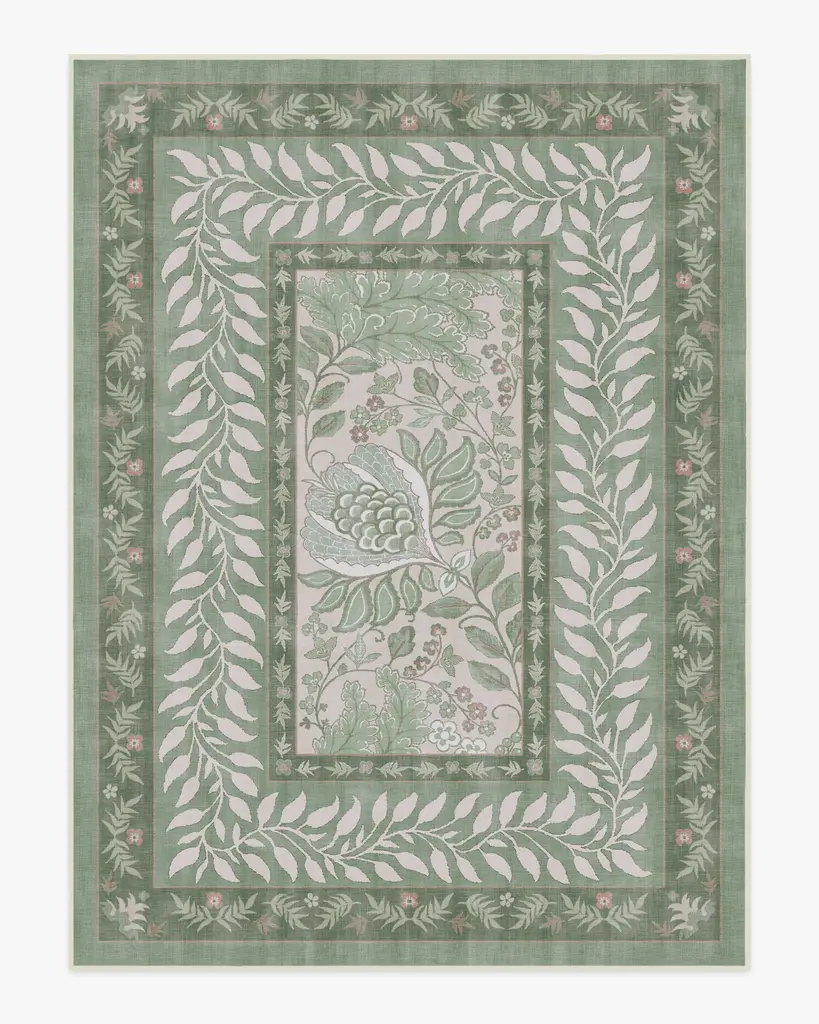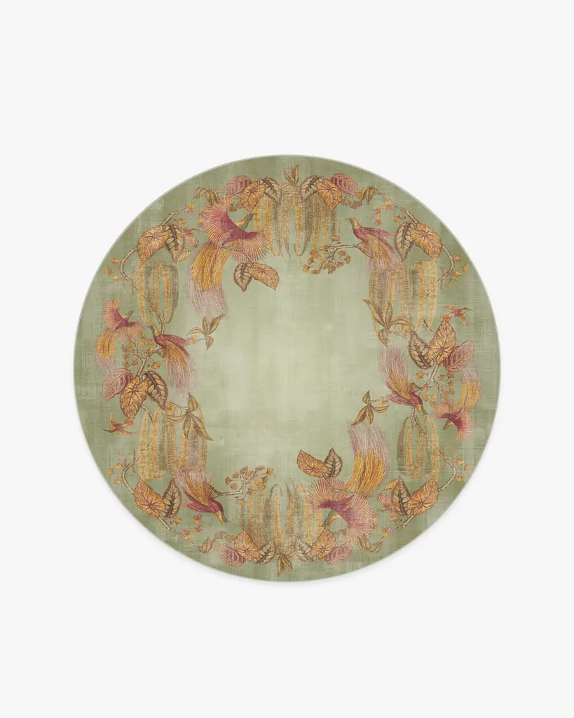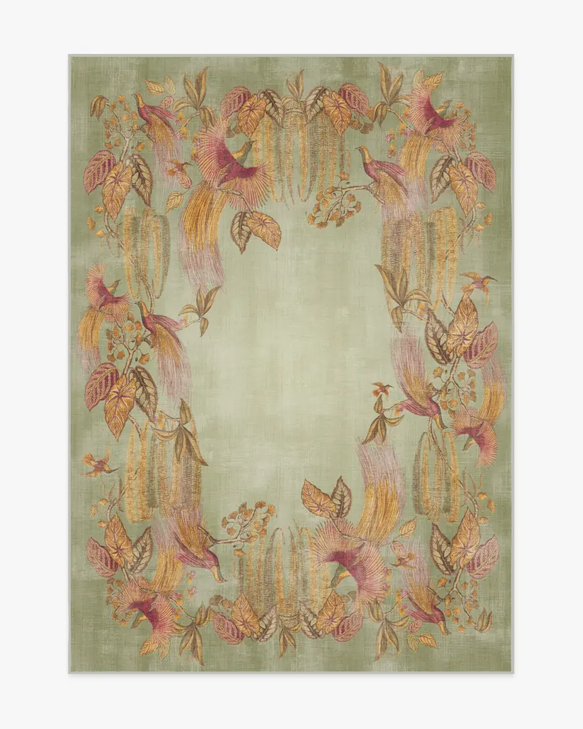 Welcome whimsy with our Sanderson Bird of Paradise Silver Fern Rug. Inspired by Sanderson's Bird of Paradise pattern, this design features motifs of birds, orchids, foliage, and feathers that evolve into an organic border. The palette beautifully blends shades of magenta, pink, green, yellow, and brown against a subtle gradient sage background. Water-resistant, stain-resistant, and machine-washable. Rug colors may vary slightly according to your device and the lighting in your space.