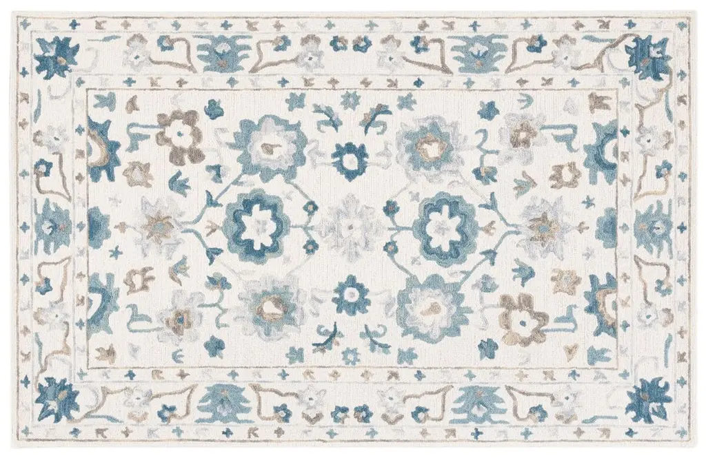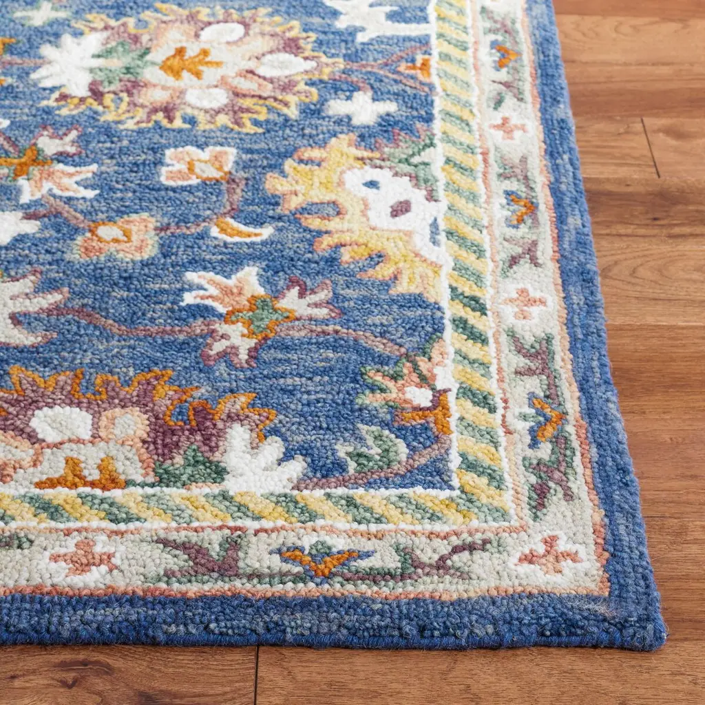 Introducing our exclusive 3' X 5' area rug, a perfect blend of vibrant blue and warm rust hues, skillfully hand-tufted in the artisanal heart of India. This small rectangle rug, measuring an inviting 1/2" in height, is meticulously crafted from a luxurious mix of 85% wool and 15% cotton, ensuring both comfort and durability. This rug exudes a bohemian charm with its intricate pattern, combining traditional floral motifs with sophisticated design elements that draw the eye and give any room an instant style upgrade. Each detail of the pattern on this rug is thoughtfully created to contribute to the overall aesthetic, making it a centerpiece in your living space. Perfect for adding a touch of elegance and culture to your home, the rug's unique combination of quality materials, expert craftsmanship, and bohemian style will make it a treasured addition to your decor for years to come. Add this piece to your collection and enjoy the timeless beauty it brings to any area it adorns.