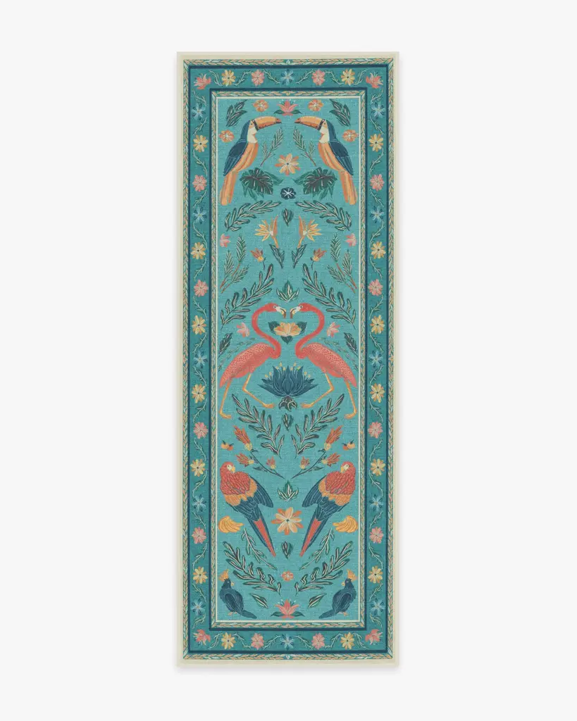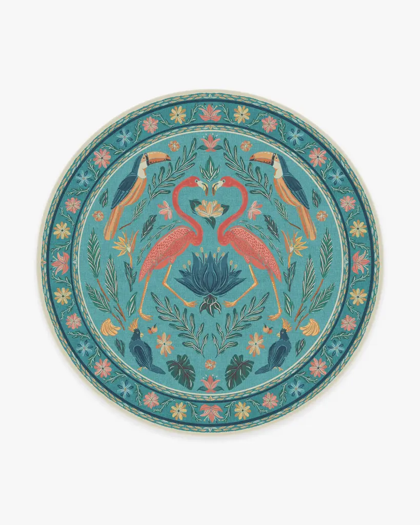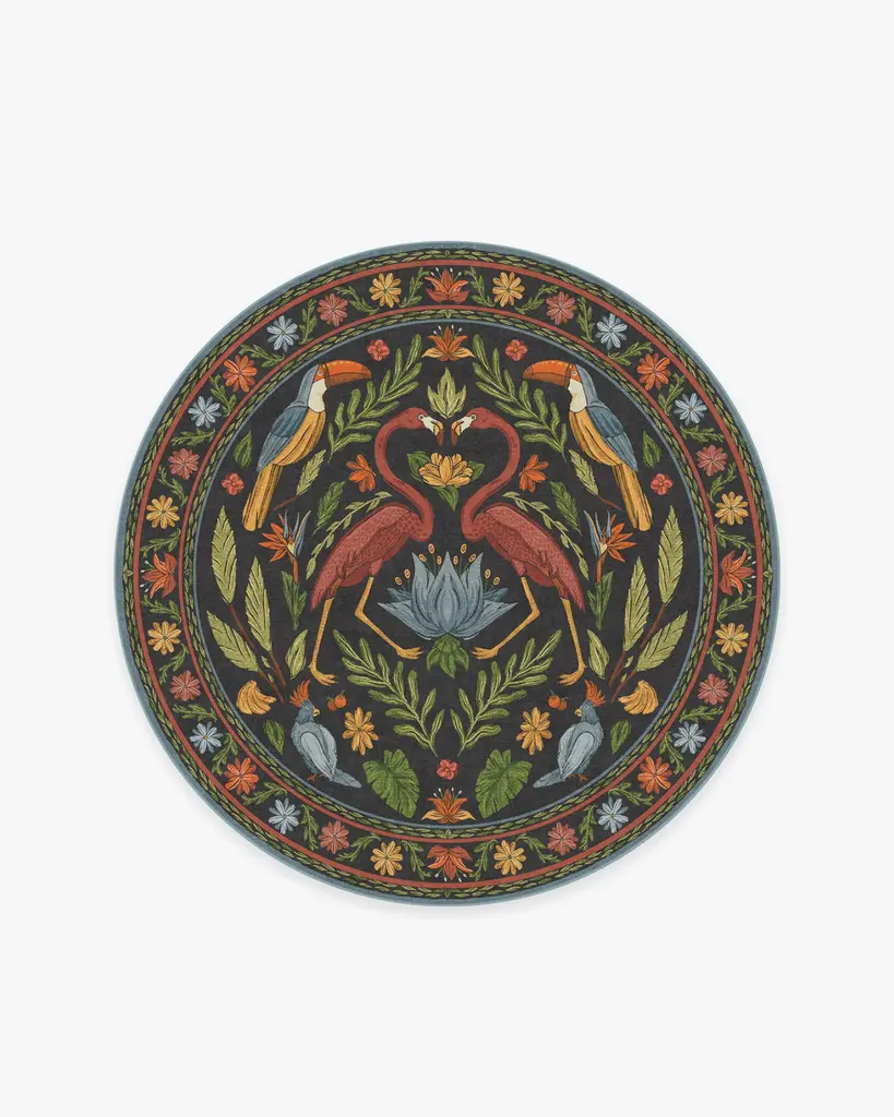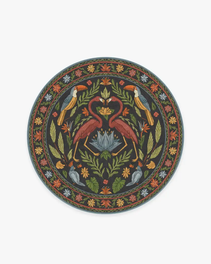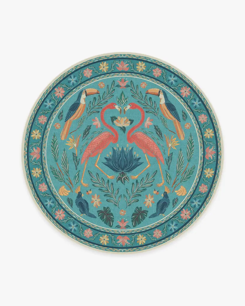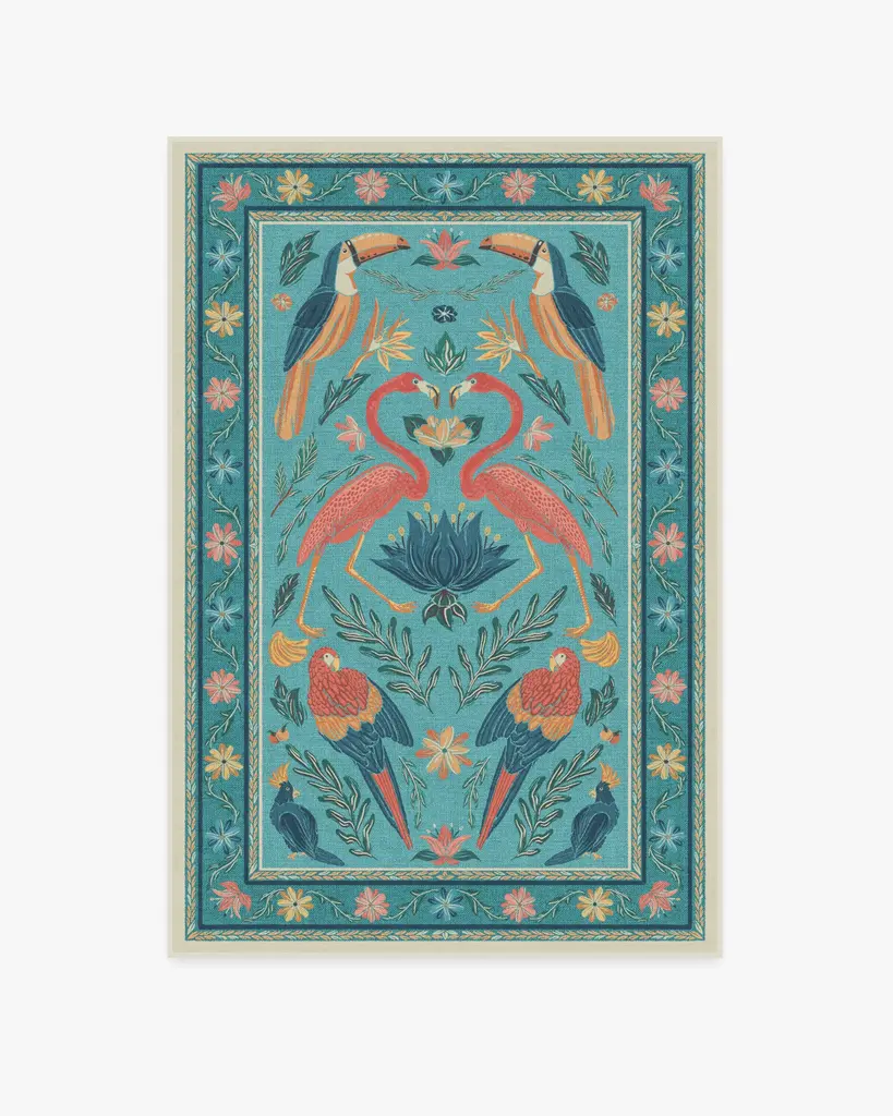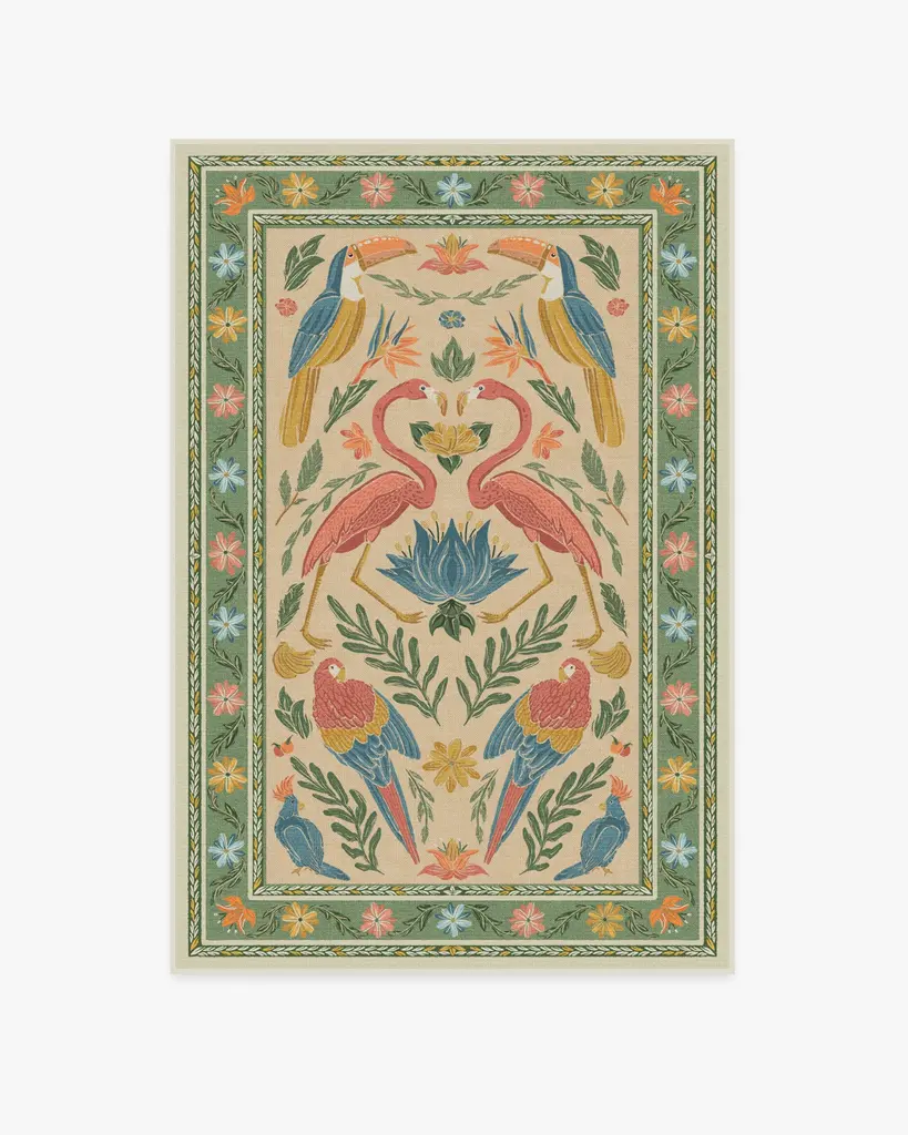 Im-peck-able. Our Birds of a Feather Green & Peach Rug is a bold and bright celebration of tropical birds - including toucans, parrots, and flamingos. This mirrored design boasts a green and peach palette of tangerine, pink, yellow, and leafy green. Set against a nude background with a green border reminiscent of Palm Beach, the bold contrast evokes lively, playful energy similar to that of the exotic birds depicted. Made from our water-resistant, stain-resistant, and machine-washable low-pile Classic material. Our Classic Rugs are woven from a velvety smooth chenille yarn. Rug colors may vary slightly according to your device and the lighting in your space.
