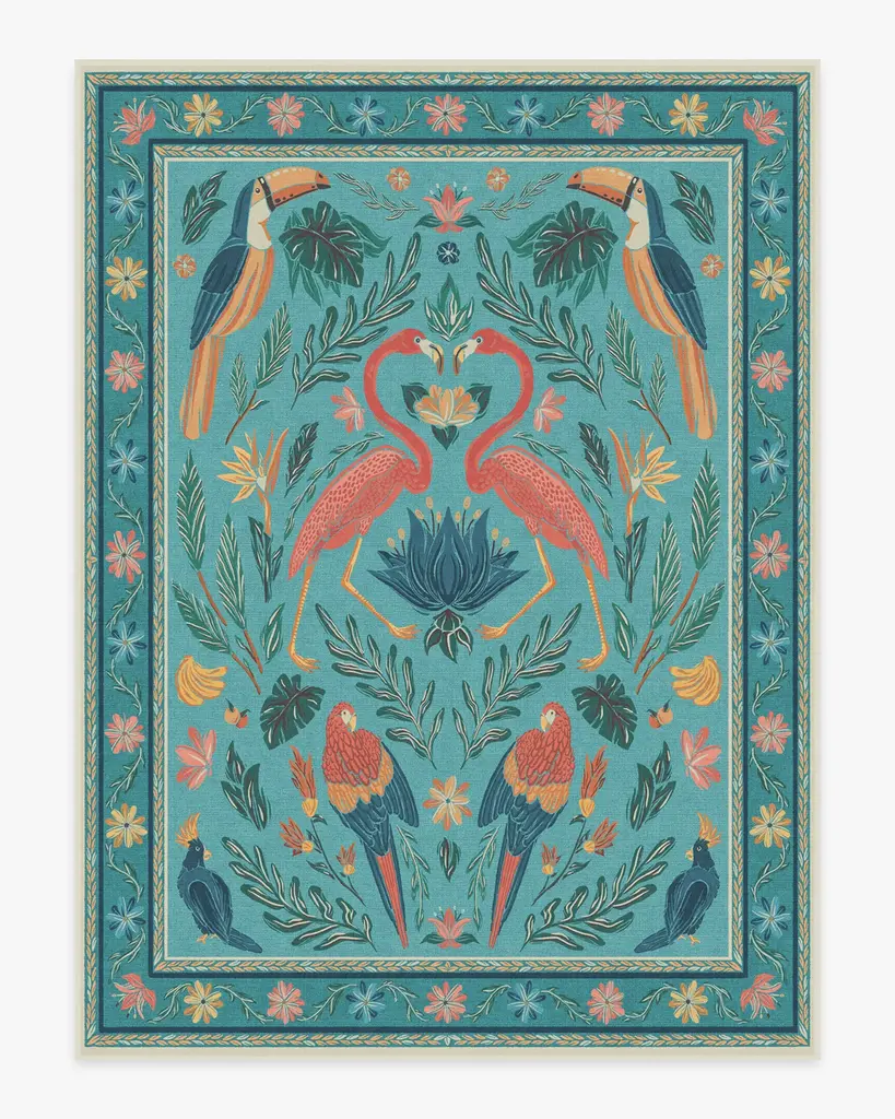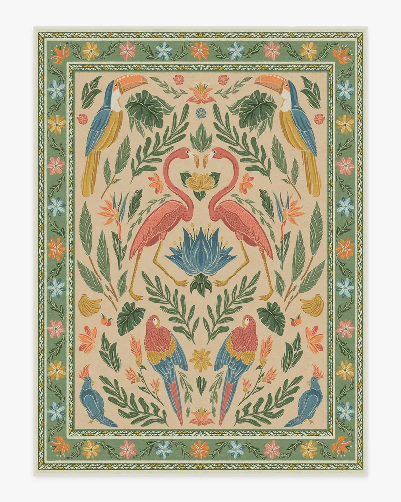 Im-peck-able. Our Birds of a Feather Green & Peach Rug is a bold and bright celebration of tropical birds - including toucans, parrots, and flamingos. This mirrored design boasts a green and peach palette of tangerine, pink, yellow, and leafy green. Set against a nude background with a green border reminiscent of Palm Beach, the bold contrast evokes lively, playful energy similar to that of the exotic birds depicted. Made from our water-resistant, stain-resistant, and machine-washable low-pile Classic material. Our Classic Rugs are woven from a velvety smooth chenille yarn. Rug colors may vary slightly according to your device and the lighting in your space.