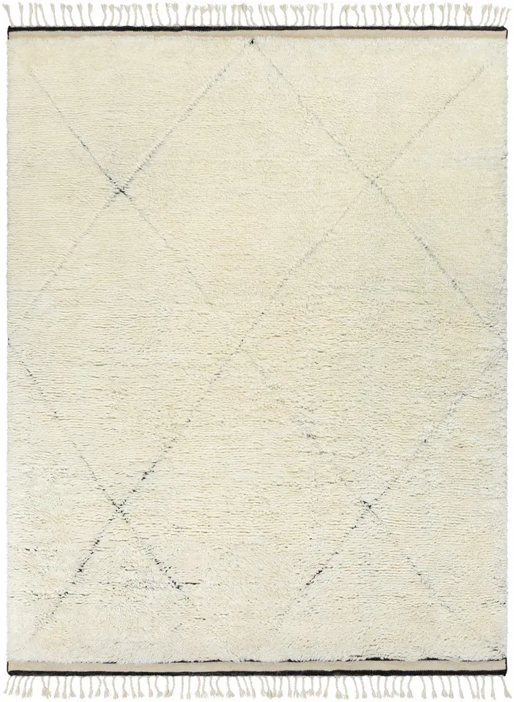 Collection: Birdwell Colors: Cream, Black Construction: Hand Knotted Material: 100% Wool Pile: High Pile Pile Height: 0.8" Styles: Transitional,Bohemian Made In: India Thickness: 1.5" Fringe Length: 4" Price Range: $$$$$ (Affordable)