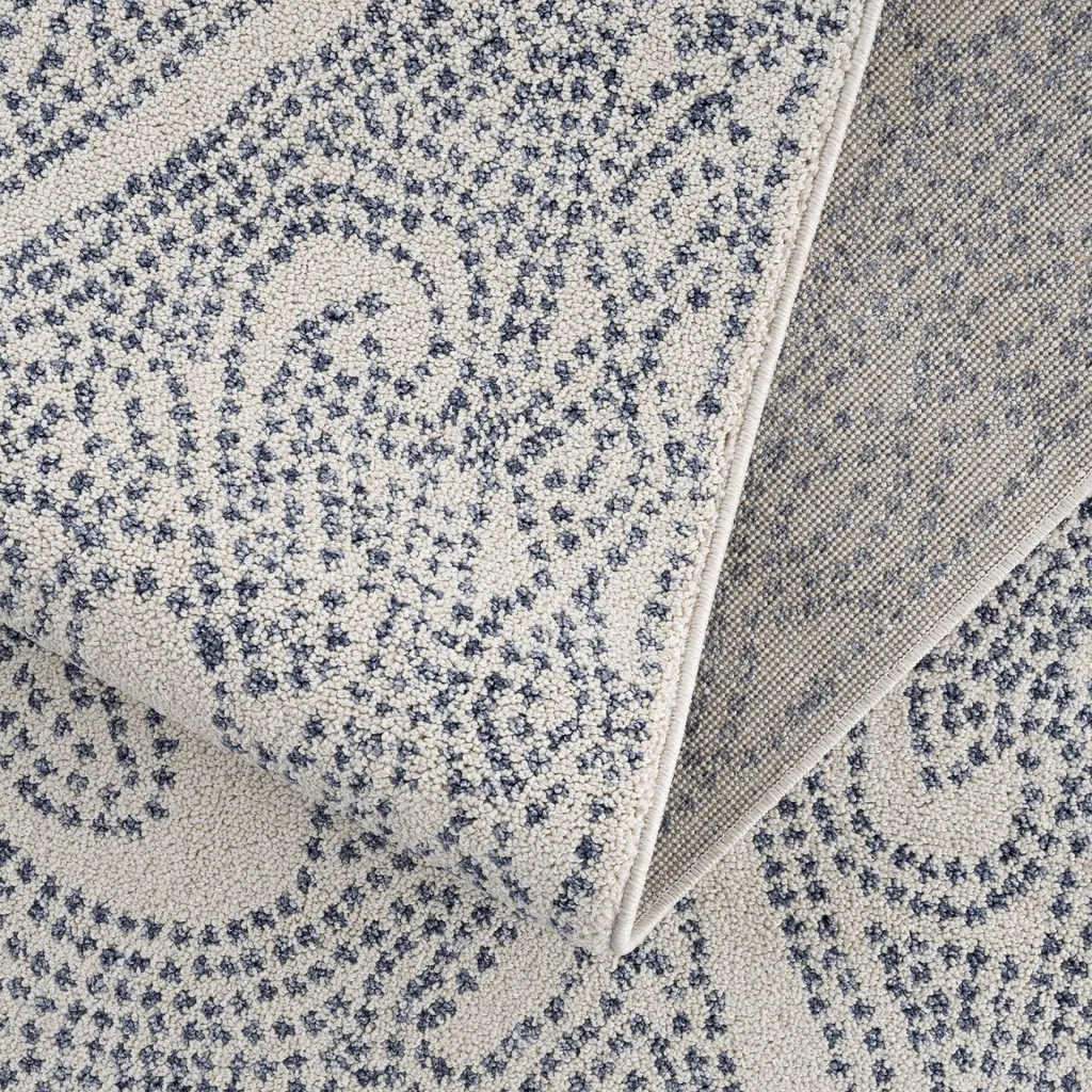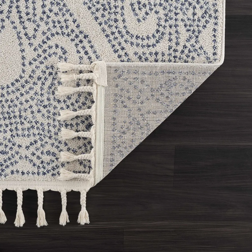 Brand: Hauteloom Collection: Birdwood Colors: Blue, Cream, Navy Construction: Machine Woven Material: 100% Polypropylene Pile: Medium Pile Pile Height: 0.24" Backing: Polyester Made In: Turkey Thickness: 0.35" Fringe Length: 3.15" Price Range: $$$$$ (Affordable)