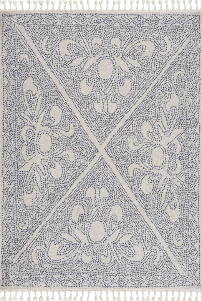 Brand: Hauteloom Collection: Birdwood Colors: Blue, Cream, Navy Construction: Machine Woven Material: 100% Polypropylene Pile: Medium Pile Pile Height: 0.24" Backing: Polyester Made In: Turkey Thickness: 0.35" Fringe Length: 3.15" Price Range: $$$$$ (Affordable)