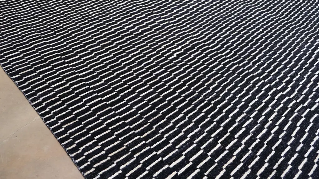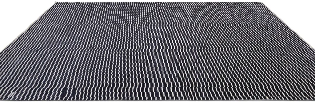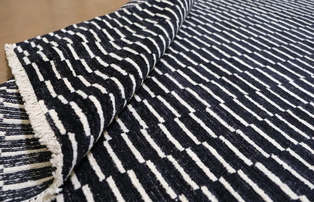 Transform your space with the dynamic elegance of this hand-knotted wool rug. Featuring a black-and-white geometric design, this rug creates a striking effect, adding depth and character to any room. The intricate, repetitive pattern makes it a stunning centerpiece for modern, minimalist, or eclectic interiors.Handcrafted by skilled artisans using traditional techniques, this rug is made from premium wool, ensuring exceptional quality and durability. The flatweave construction gives it a sleek, low-pile surface that is perfect for high-traffic areas while being easy to clean and maintain. The monochromatic color palette adds versatility, making it an ideal addition to any space.Key Features:Origin: Hand-knotted in PakistanMaterial: Hand Spun WoolDesign: Black-and-Ivory geometric patternDimensions: 8'9" x 12'2"Pile: Low Plush Pile for easy maintenance and durabilityColors: Black and IvoryStyle: Perfect for modern, minimalist, and eclectic interiorsThis rug embodies the perfect fusion of traditional craftsmanship and contemporary design, offering a unique aesthetic that complements both casual and formal spaces. Elevate your home decor with this exquisite hand-knotted wool rug that showcases the artistry of Pakistani weaving.