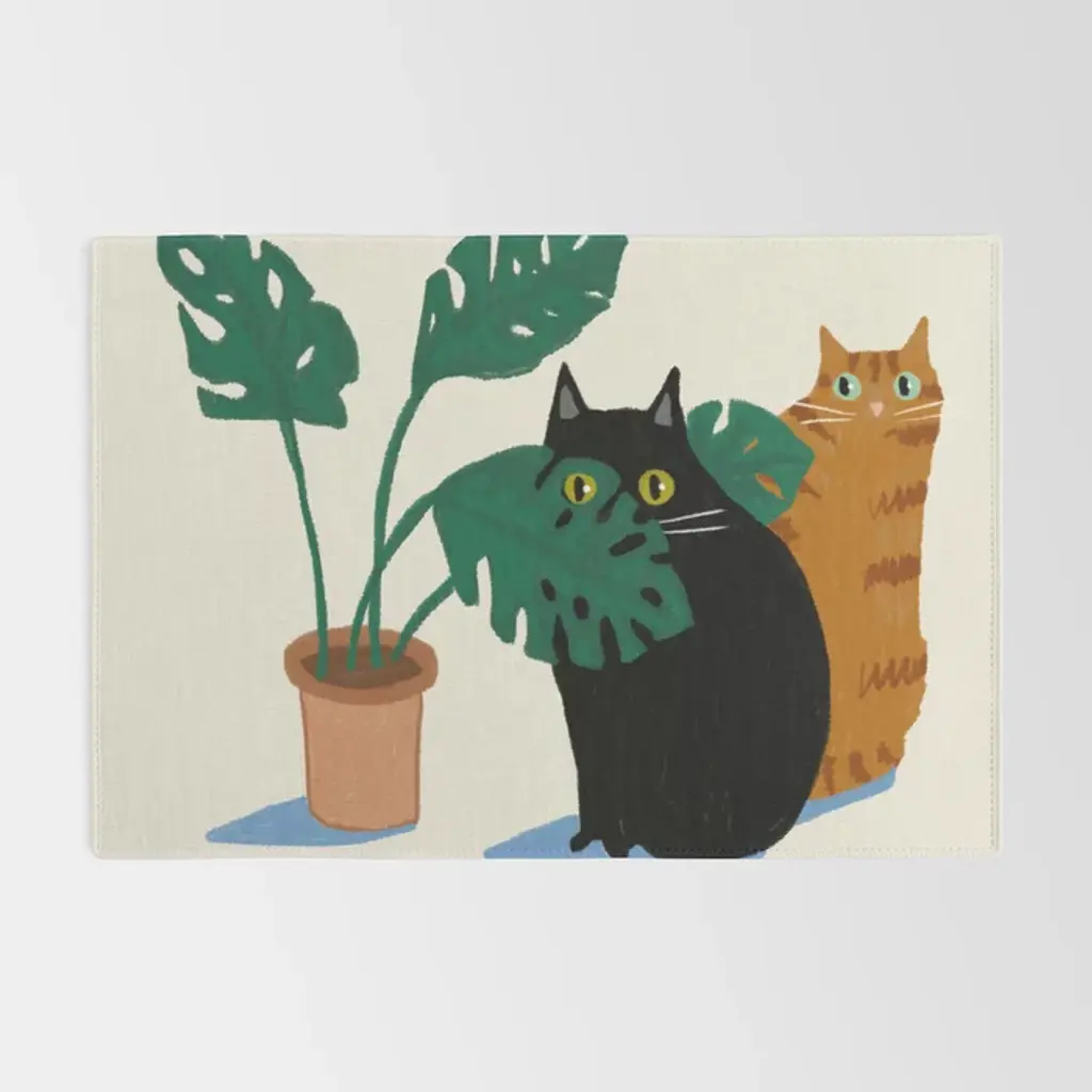Black Cat & Orange Tabby Cat With Monstera Plant Rug