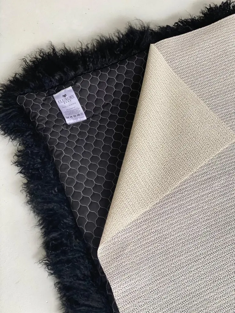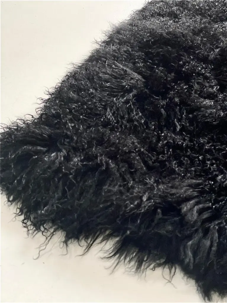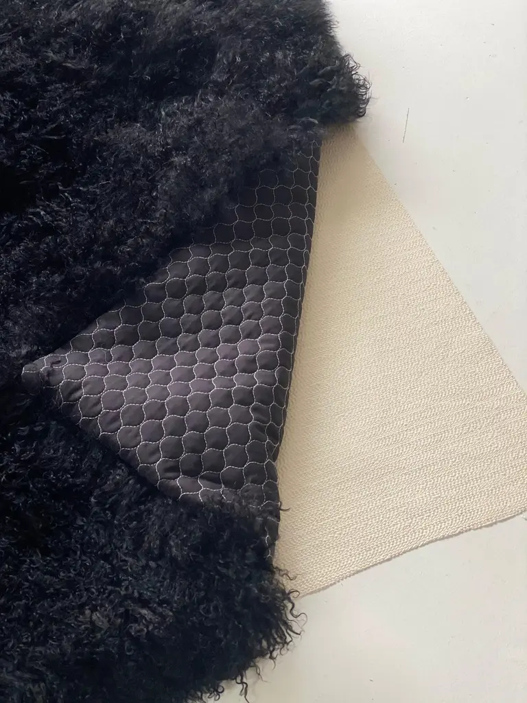 Elevate the luxury of your decor with this luxurious Black Fur Rug. Whether styling a bedroom or adding luxury elements to a sitting area, this exquisite real fur rug will uplift the elegance and ambiance of any room. Each piece is handcrafted from the most beautiful and irresistible Mongolian sheepskin resulting in opulence and sophisticated design as the Fine curly/ crimped fur like wool effortlessly spreads across the floor. The long and fluffy wool pile of Mongolian fur features lustrous and silky sheen. The light and shade captured in the wool create elements of depth and highlights within the fur rug that will bring character and modern aesthetics to a home.Featuring dimensions of 37x54" with a straight edge design, the rug comes with a quilted polyester/cotton reverse for additional fullness. Also included is a non slip grip lining. Each fur rug is carefully handcrafted by Australian designer and furrier, Emily Barbara. It needs to be celebrated that each Mongilian fur rug that is made will have its own unique beauty and charm, defined by its curly and crimped wool. OUR MONGOLIAN FUR RUGS CAN BE CUSTOMISED TO ANY SHAPE OR SIZE. Please allow aprox 4 to 8 weeks for productionFeatures:handcrafted from genuine Mongolian SheepskinsFur like qualitiescolor: blackwool length 2-4 inchesapproximate dimensions: 37x54 inchesquilted cotton reversecomes with non slip gripnatural by-product sheepskinsstraight edge designCaring for this productSpot clean only with lukewarm water and gentle wool detergent.Do not wash, do not brushProfessional dry clean onlyKeep away from direct heatkeep away from direct sunlight to prevent color fadingshake outside and allow to air in the shadeloose wool fibers may be found caused by productiongentle vacuumA nonslip grip is highly recommended for floor rugs as skin leather is Fine.Natural product:This is a natural product, therefore, no two sheepskins are ever alike, therefore variation in markings, color tone, texture, wool length, and wool density are all classified as natural characteristics.