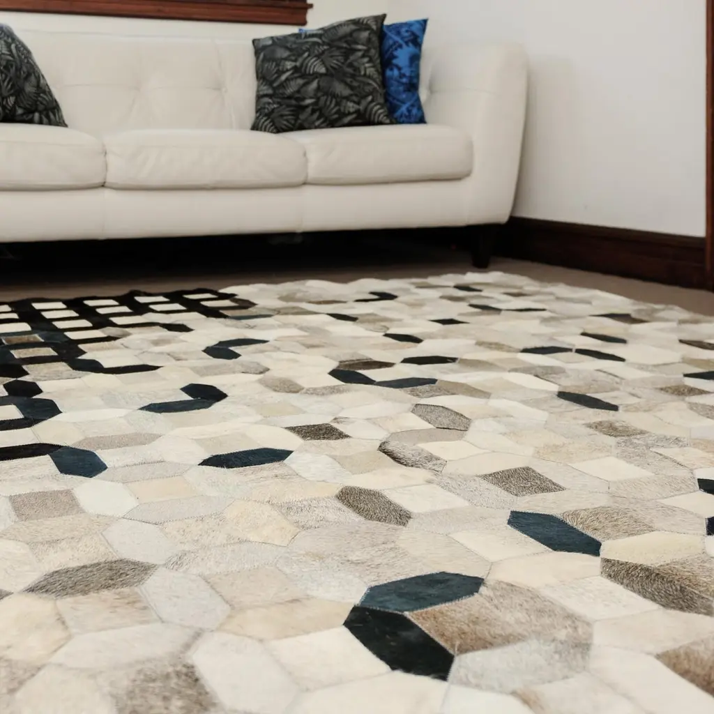 Crammed with color, this new release under our Alta line will add spades of charisma and sophistication to your interior. Black is combined with natural grey shades to create a one-of-a-kind look – guaranteed to refresh and Revive your interior!The Alta range combines smaller tiles and tessellation’s with pops of color, in a combination that delivers on style, but saves on price. Small measures 2 x 1.6m (6’7” x 5’3”). Large measures 2 x 3M (6’7” x 9’8”) and X-Large measures 2.75 x 3.65m (9' x 12')Art Hide rugs are usually made to order. Please allow around 4-5 weeks for delivery.