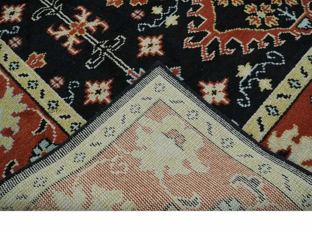Expertly handcrafted, this Traditional Oriental wool rug features a harmonious blend of black, rust, and beige. Its intricate hand-knotted design adds a touch of elegance. Custom-made with high-quality wool, this rug is not only visually appealing but also durable and long-lasting. Hand-Knotted Made with Wool Sizes are made to order in 30-45 days Color: Black, Rust and Beige USERS GUIDE Avoid prolonged moisture Vacuum regularly and/or shake to remove dust Do not pull any loose threads. Use scissors to simply cut the ends The blot spills immediately with a white cloth. Harsh chemicals may damage or fade the rug Use rug protectors under heavy furniture