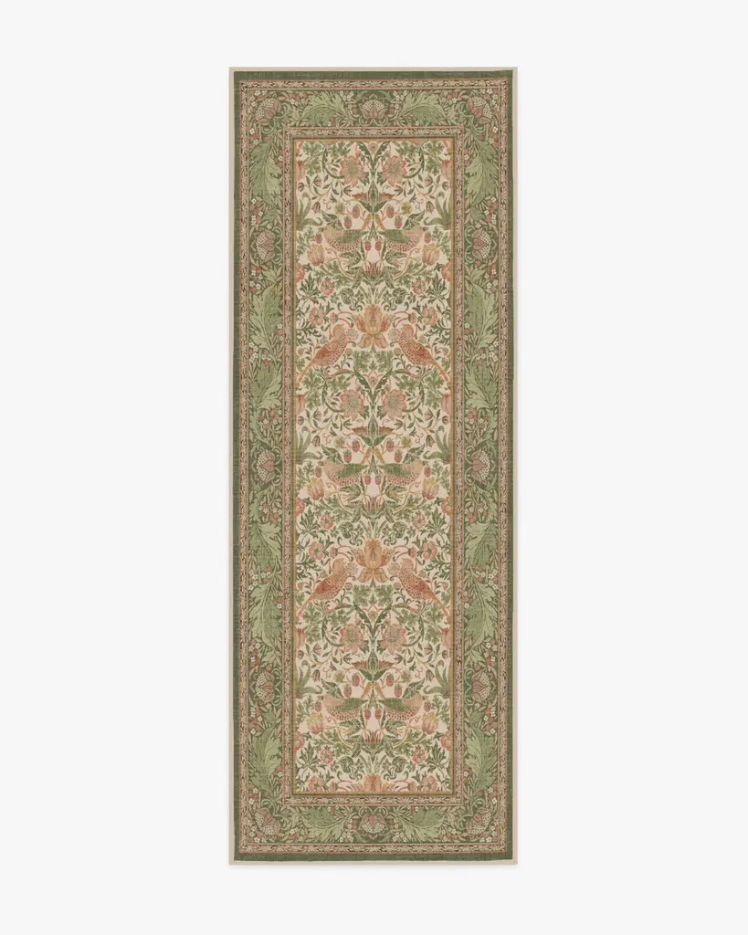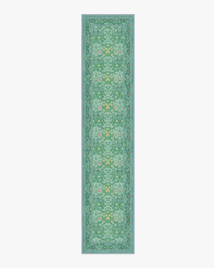 Fall in love with our whimsical Morris & Co. Blackthorn Multicolor Jade Rug. Originally designed for wallpaper by John Henry Dearle in 1892, this intricate weave of blossoms, blooms, and vines layers pops of bold pinks, sunshine yellows, playful greens, and vibrant blues for a cheerful composition. We have reimagined the classic pattern to include a border that anchors the design with a touch of formality and visual order. Water-resistant, stain-resistant, and machine-washable. Rug colors may vary slightly according to your device and the lighting in your space.