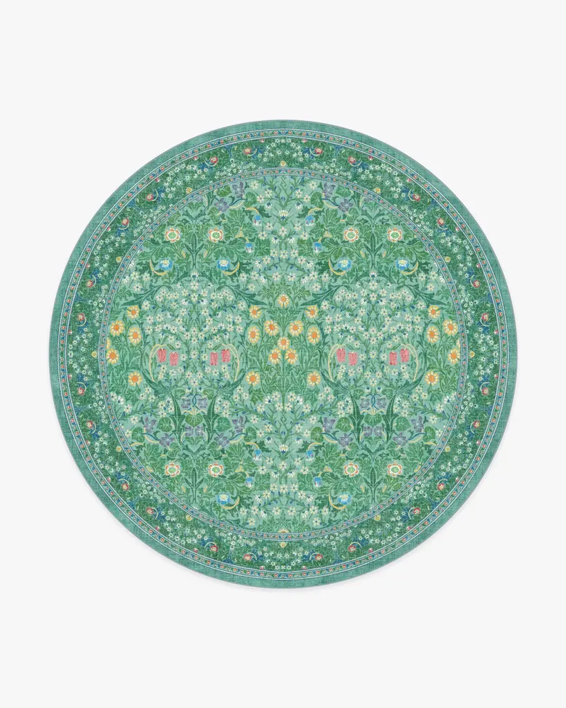 Fall in love with our whimsical Morris & Co. Blackthorn Multicolor Jade Rug. Originally designed for wallpaper by John Henry Dearle in 1892, this intricate weave of blossoms, blooms, and vines layers pops of bold pinks, sunshine yellows, playful greens, and vibrant blues for a cheerful composition. We have reimagined the classic pattern to include a border that anchors the design with a touch of formality and visual order. Water-resistant, stain-resistant, and machine-washable. Rug colors may vary slightly according to your device and the lighting in your space.