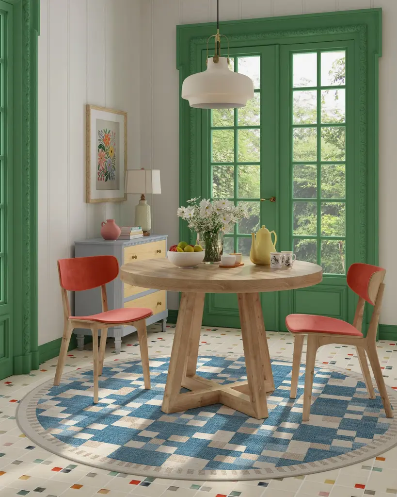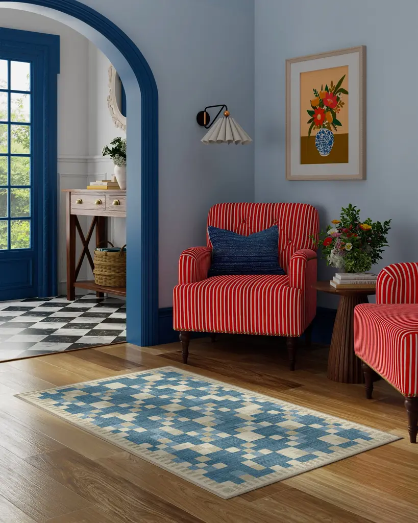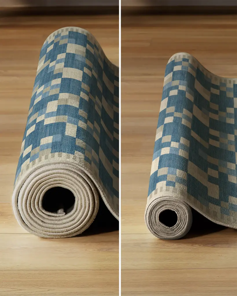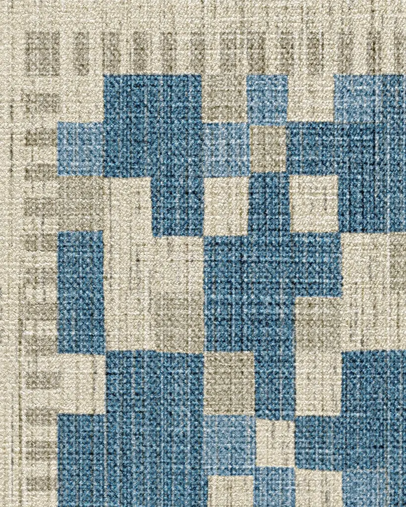 Blending nostalgia with modern refinement, the Blake Blue Rug features a quilt-like pattern with subtle irregular edgework that enhances its vintage appeal. A mix of light and deep slate blues, accented with neutral stone rests against a classic cream background for an effortlessly elegant look. Water-resistant, stain-resistant, and machine-washable. Colors may vary slightly according to your device and the lighting in your space.
