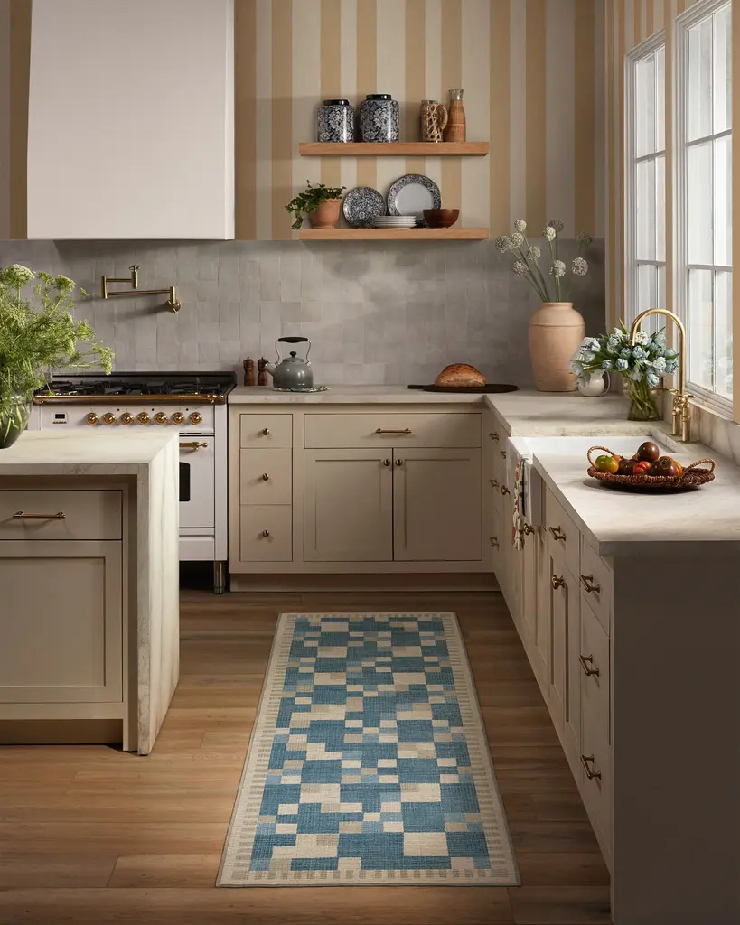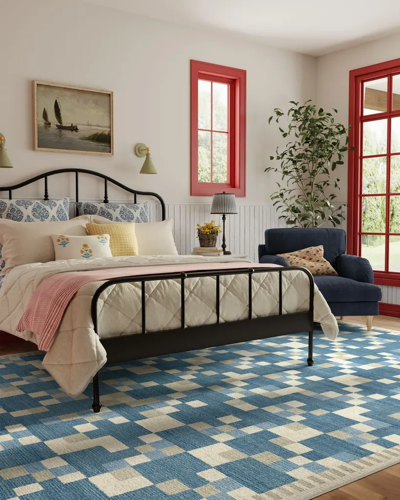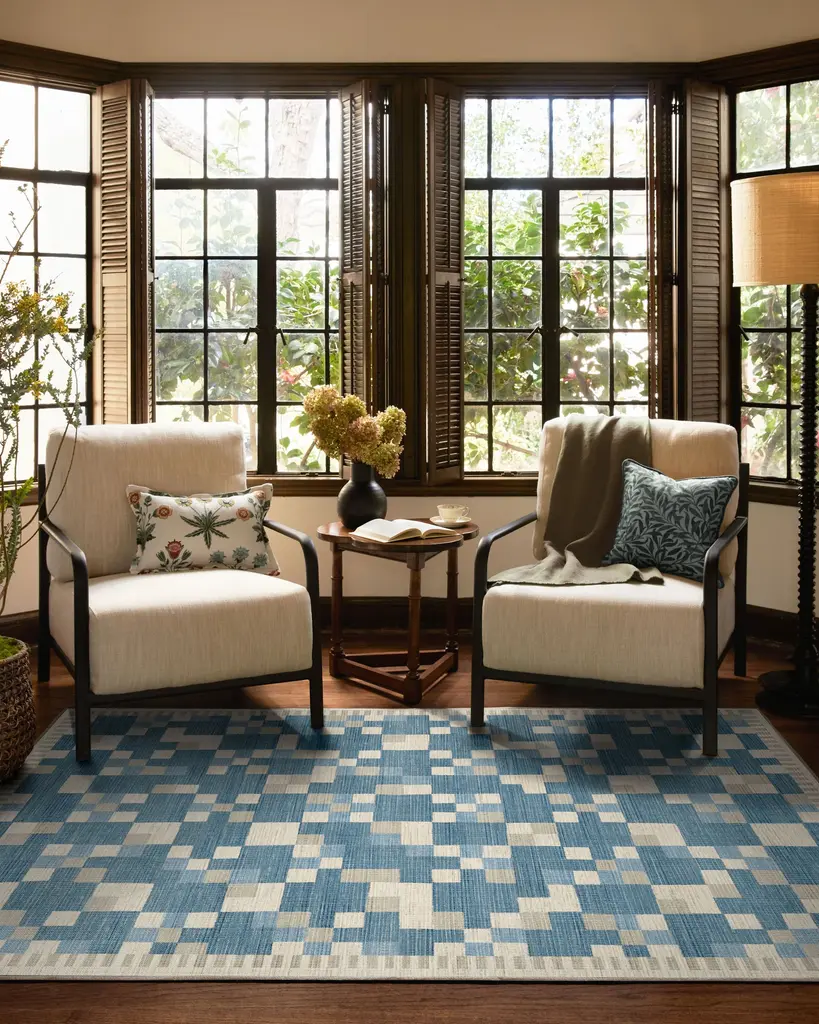 Blending nostalgia with modern refinement, the Blake Blue Rug features a quilt-like pattern with subtle irregular edgework that enhances its vintage appeal. A mix of light and deep slate blues, accented with neutral stone rests against a classic cream background for an effortlessly elegant look. Water-resistant, stain-resistant, and machine-washable. Colors may vary slightly according to your device and the lighting in your space.