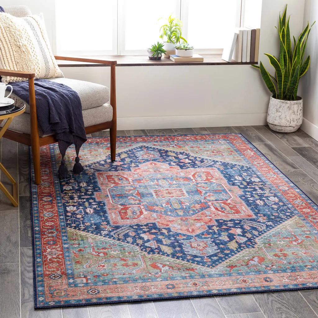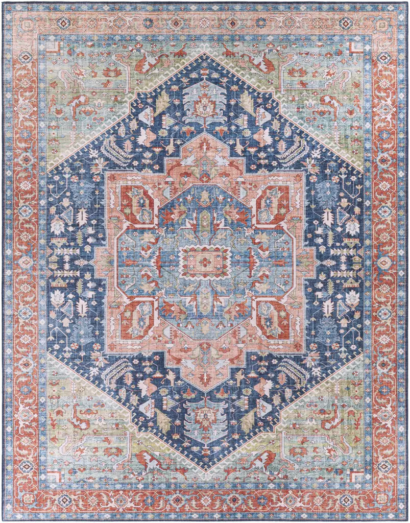 Collection: Blaze Colors: Navy, Peach, Coral, Olive, Rust, Light Blue Construction: Machine Woven Material: 100% Polyester Pile: No Pile Styles: Traditional Backing: Canvas Made In: China Thickness: 0.28" Price Range: $$$$$ (Most Affordable)