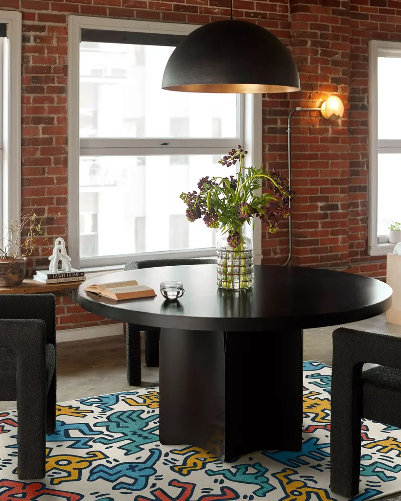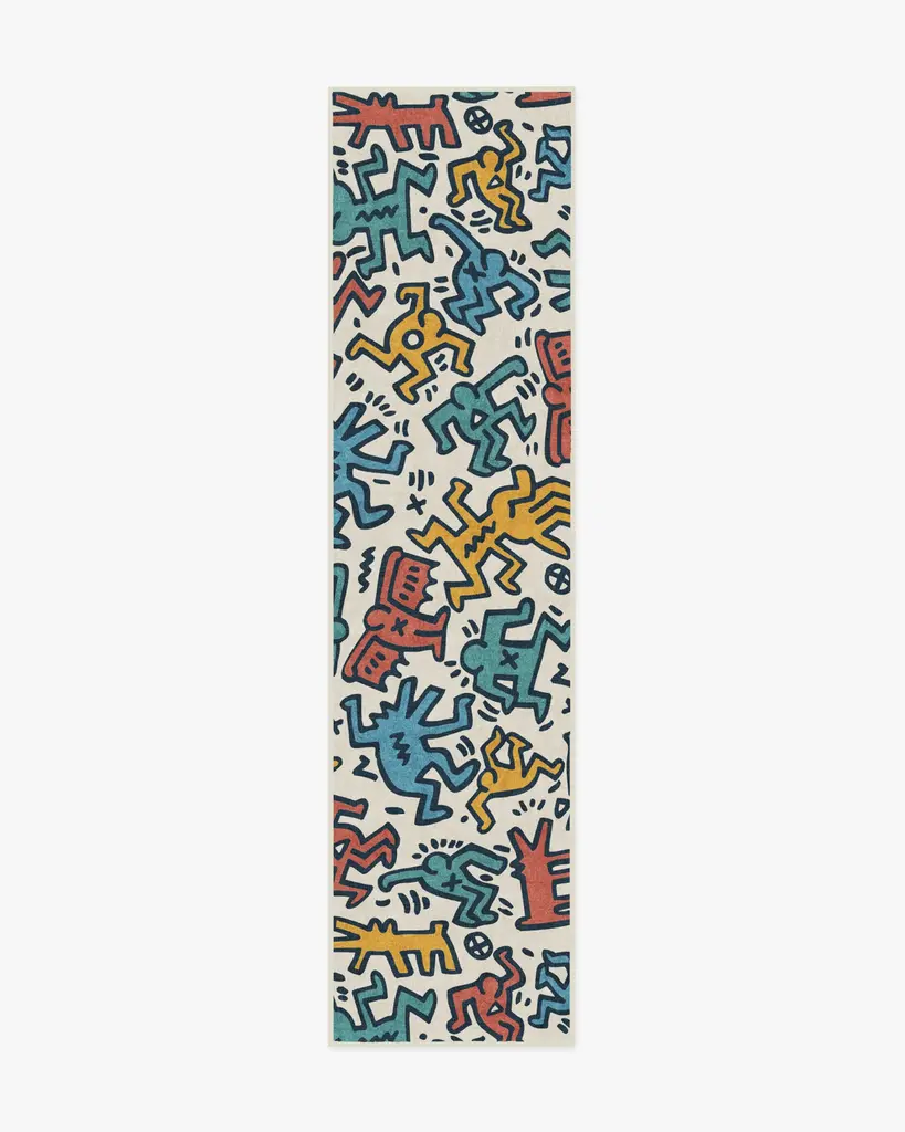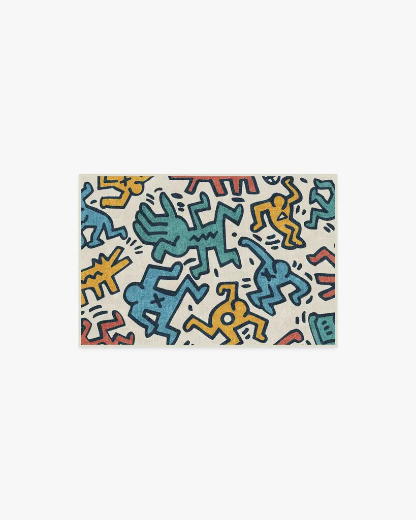 A colorful and artistic design. The bright palette of our Keith Haring Block Party Multicolor Rug matches the level of high-energy movement that Haring's work embodies. This is accomplished with vivid yellow, turquoise, navy blue, brick red, and dark aqua blue on an ivory background. Water-resistant, stain-resistant, and machine-washable.