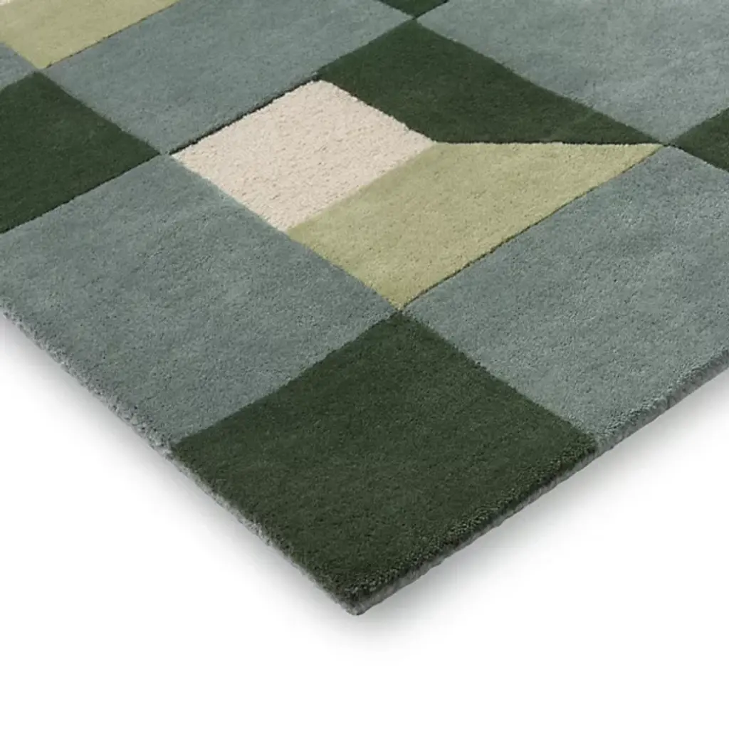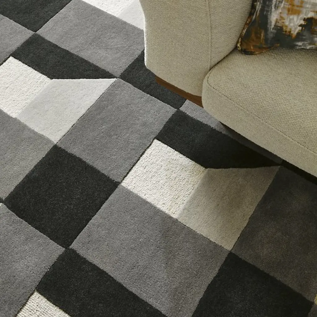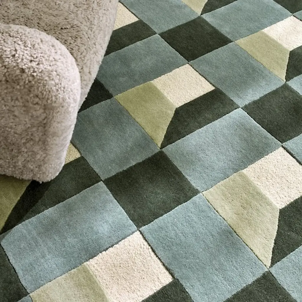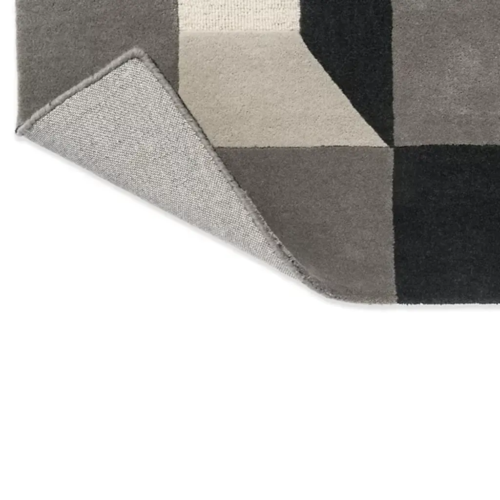The Blocks Area Rug from Harlequin presents a geometric pattern that creates optical depth by carefully arranging squares and rectangles. Handtufted from pure new wool in India, this rug uses tonal variations to suggest three-dimensional forms within the flat surface. The pattern repeats across the field, with each block appearing to cast shadows or reflect light differently. The hand-tufted construction allows for precise color placement that makes the geometric illusion possible. This rug suits rooms where you want to add architectural interest through floor covering rather than wall treatments.