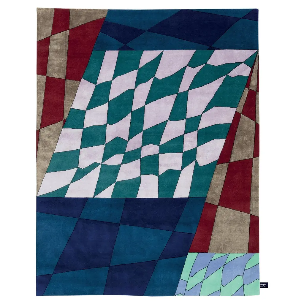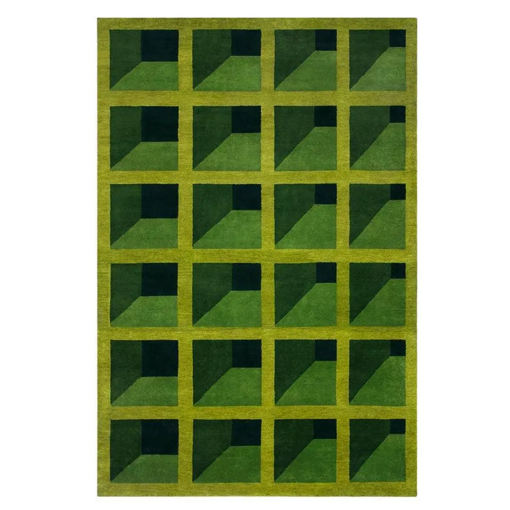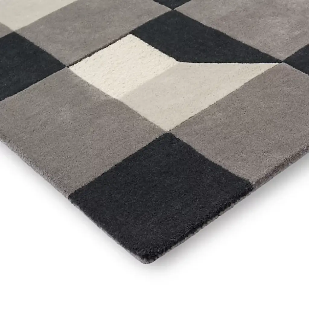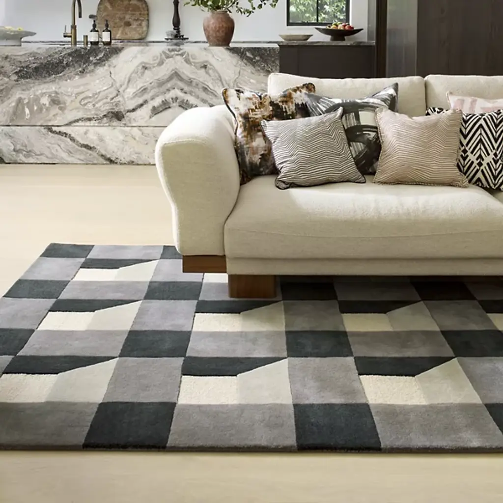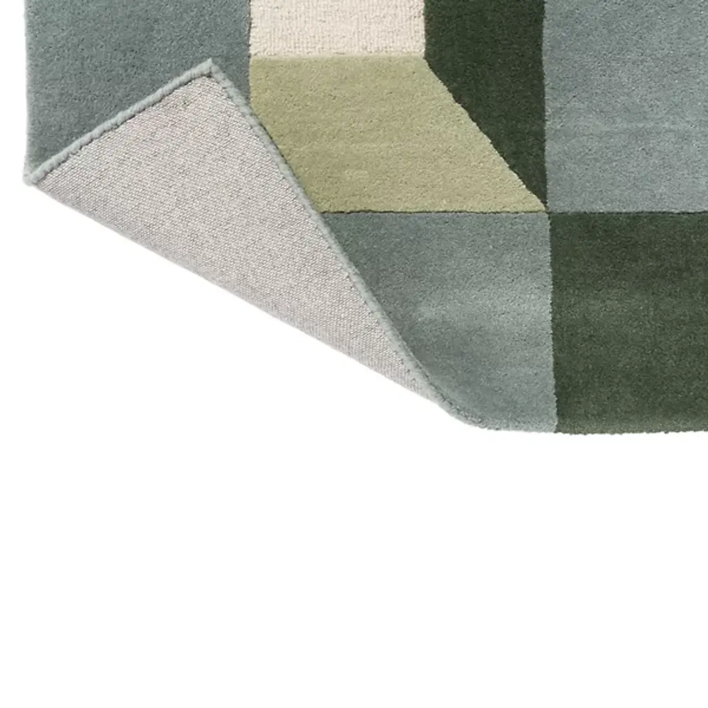 The Blocks Area Rug from Harlequin presents a geometric pattern that creates optical depth by carefully arranging squares and rectangles. Handtufted from pure new wool in India, this rug uses tonal variations to suggest three-dimensional forms within the flat surface. The pattern repeats across the field, with each block appearing to cast shadows or reflect light differently. The hand-tufted construction allows for precise color placement that makes the geometric illusion possible. This rug suits rooms where you want to add architectural interest through floor covering rather than wall treatments.