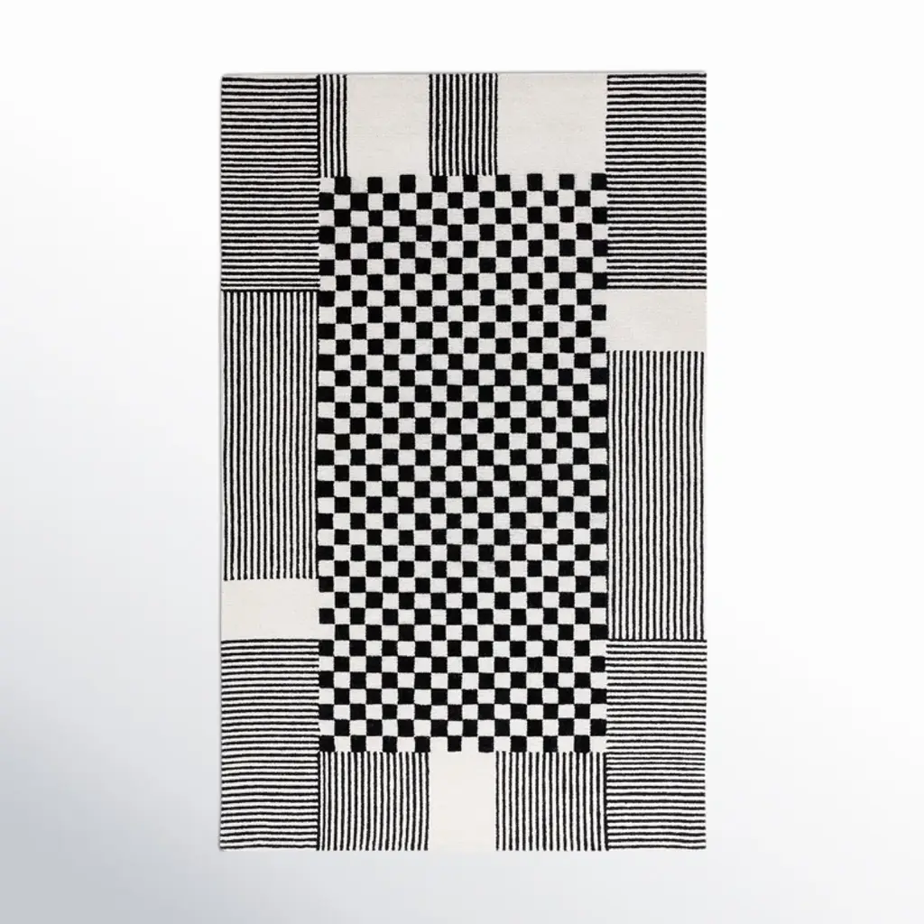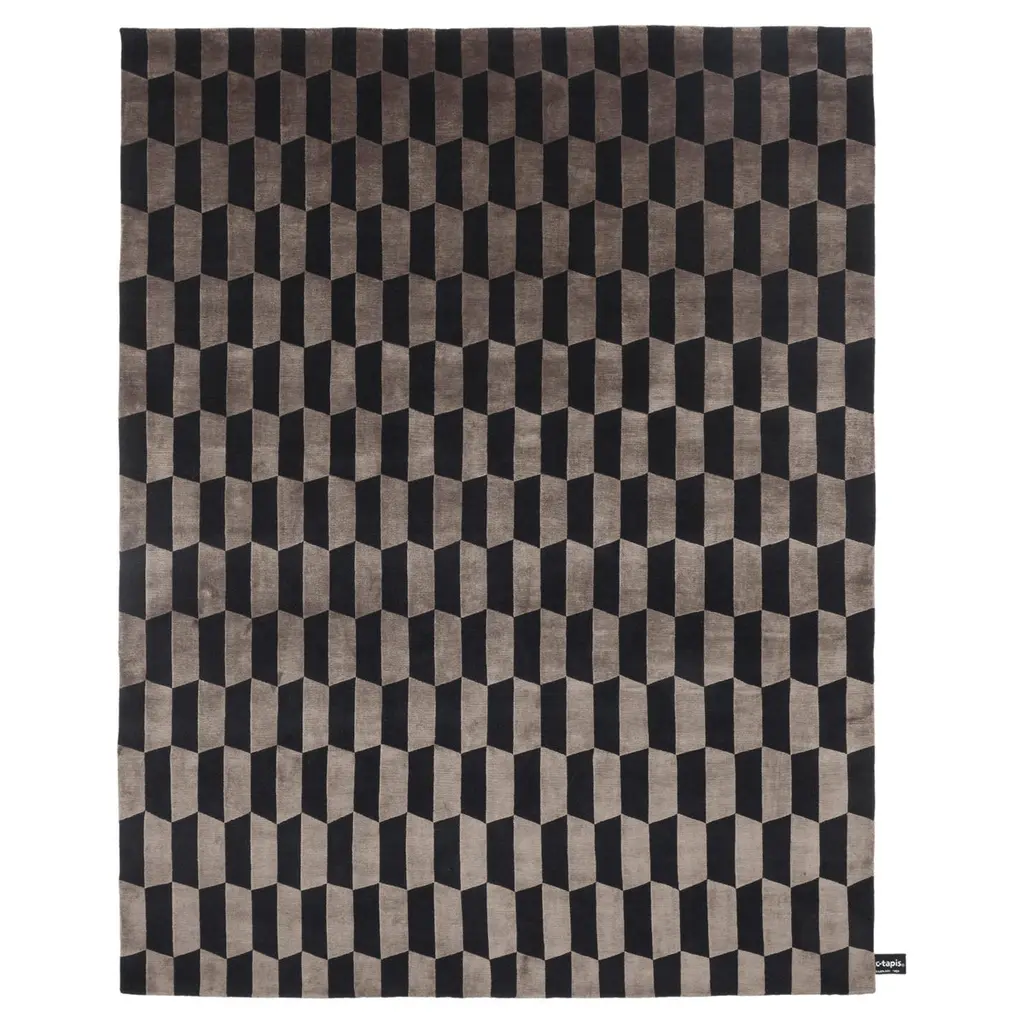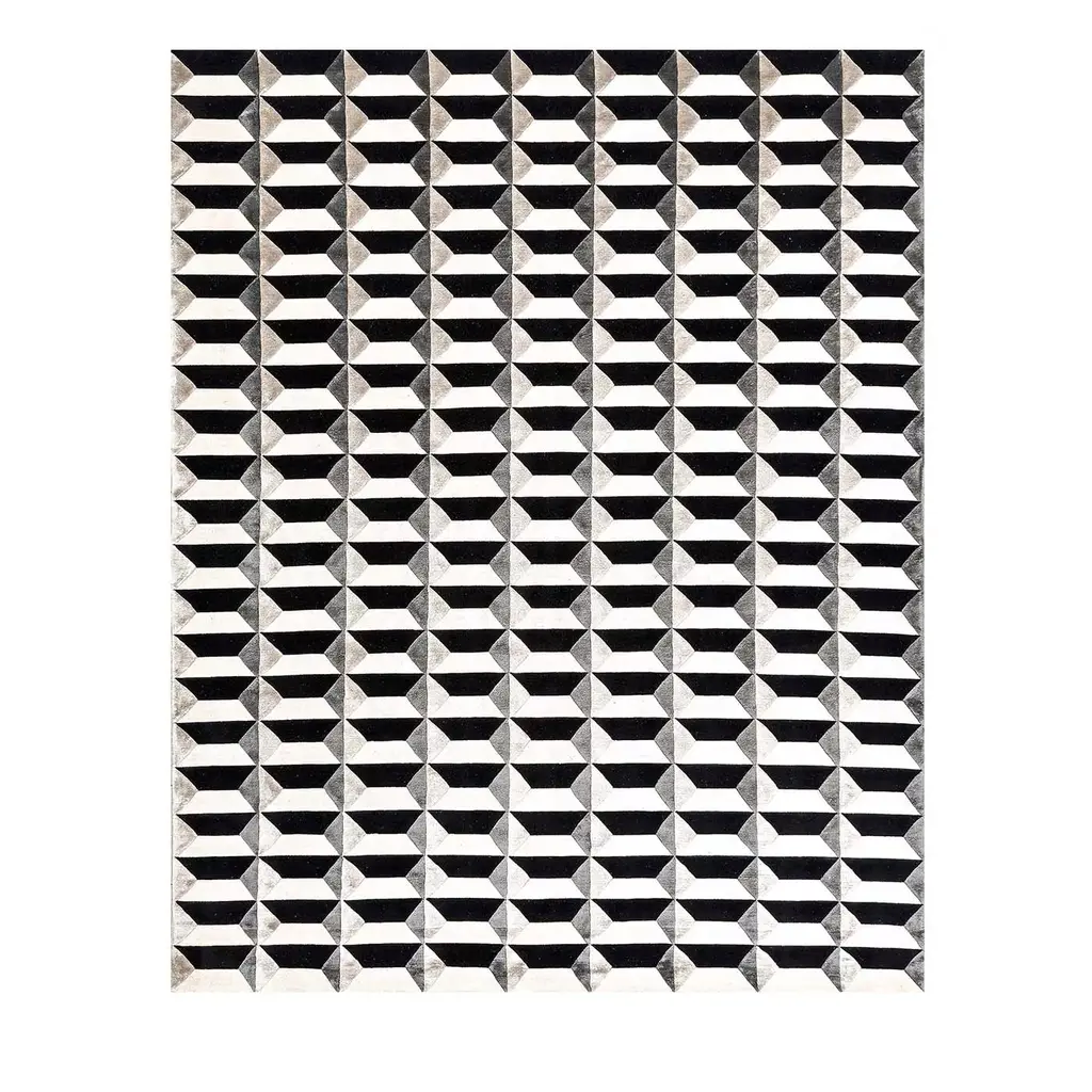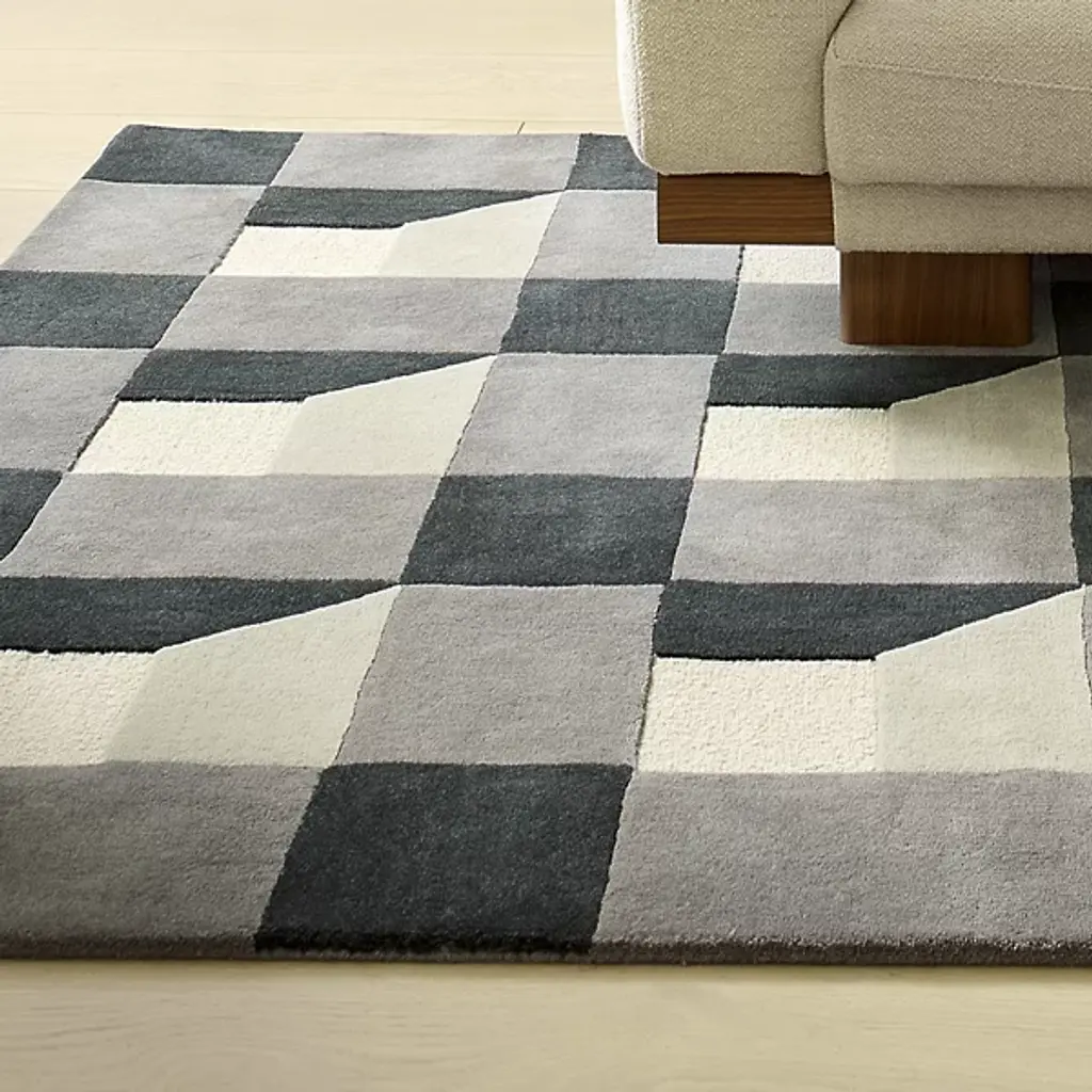 The Blocks Area Rug from Harlequin presents a geometric pattern that creates optical depth by carefully arranging squares and rectangles. Handtufted from pure new wool in India, this rug uses tonal variations to suggest three-dimensional forms within the flat surface. The pattern repeats across the field, with each block appearing to cast shadows or reflect light differently. The hand-tufted construction allows for precise color placement that makes the geometric illusion possible. This rug suits rooms where you want to add architectural interest through floor covering rather than wall treatments.