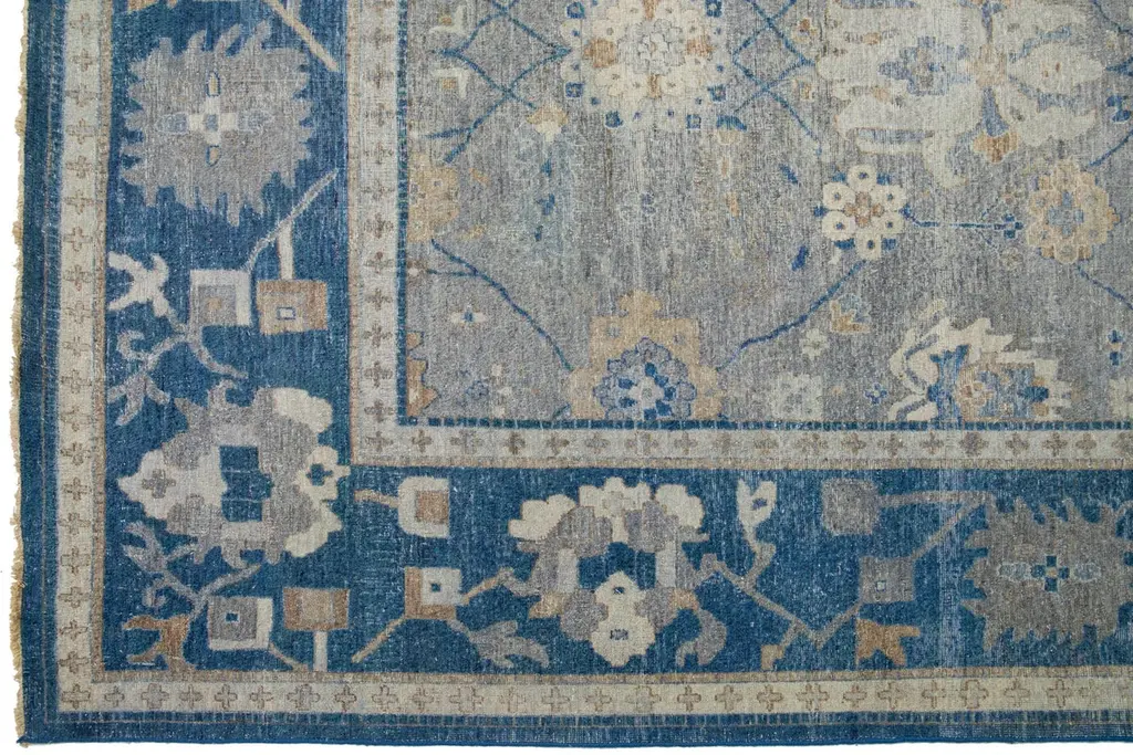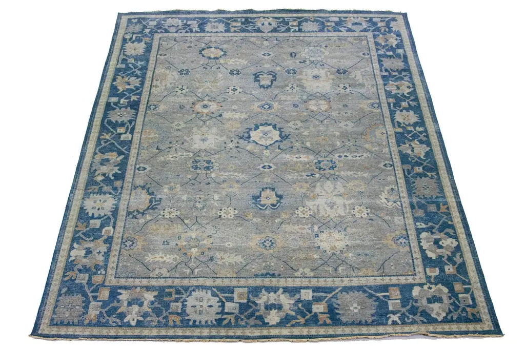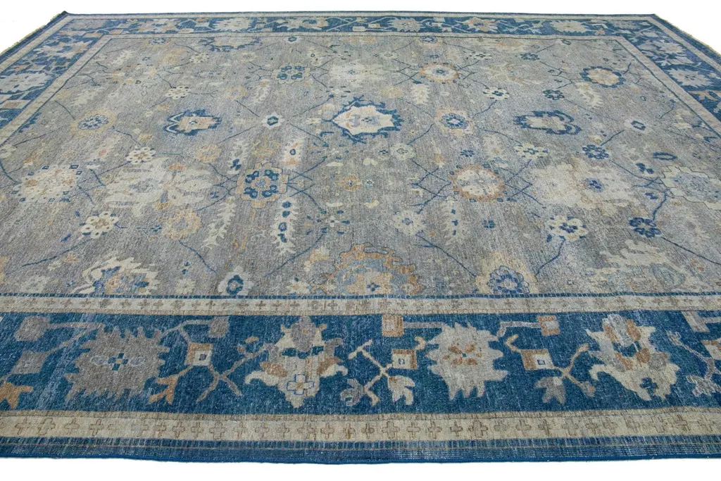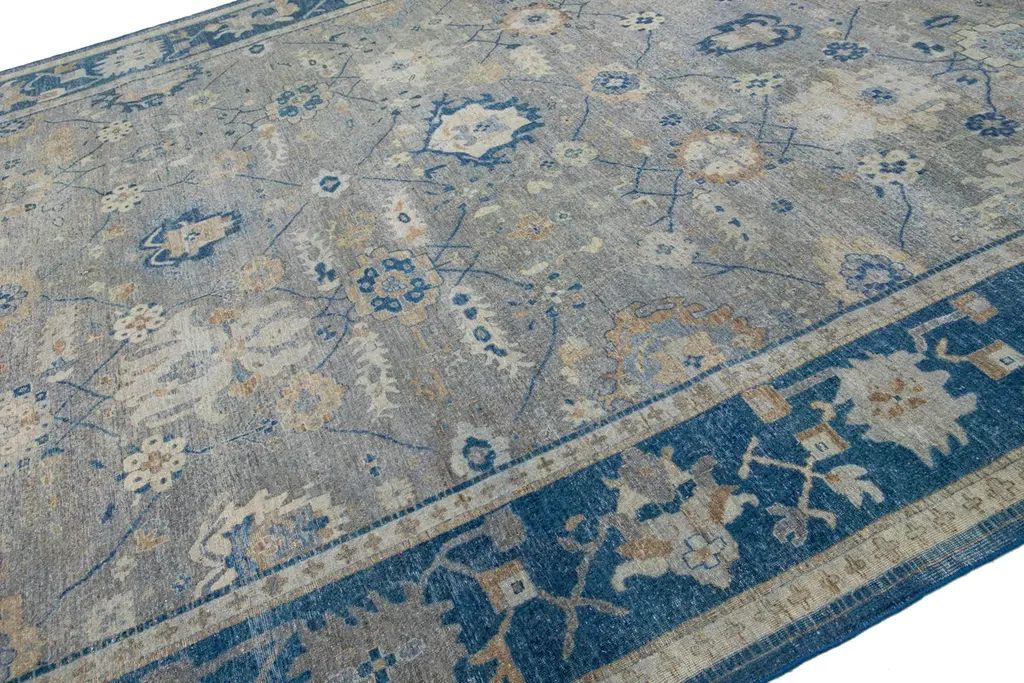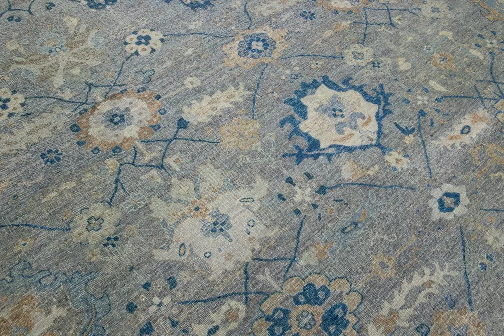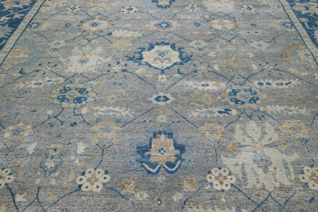 The Artisan line from Apadana infuses an exquisite antique style into any space. This hand-knotted rug exhibits a stunning all-over floral pattern with a gray color scheme and accents of blue. It measures 11' 11" x 15' 11" in size.Our rugs are professionally cleaned before shipping.