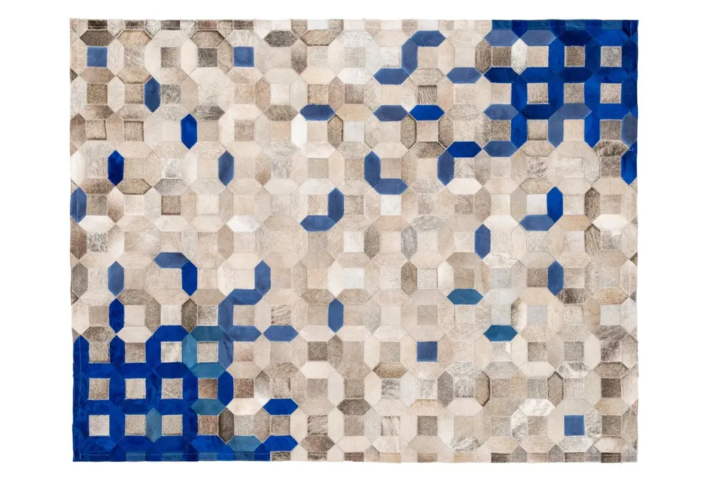 Crammed with color, this new release under our Alta line will add spades of charisma and sophistication to your interior. The blue is combined with natural grey shades to create a one of a kind look guaranteed to refresh and revive your interior!The Alta range combines smaller tiles and tessellation’s with pops of color in a combination that delivers on style but saves on price. Small measures 2 x 1.6m (6’7” x 5’3”). Large measures 2 x 3M (6’7” x 9’8”).This item can easily be customized to any color size or shape upon request.Art Hide rugs are usually made to order. Please allow around 4-5 weeks for delivery.