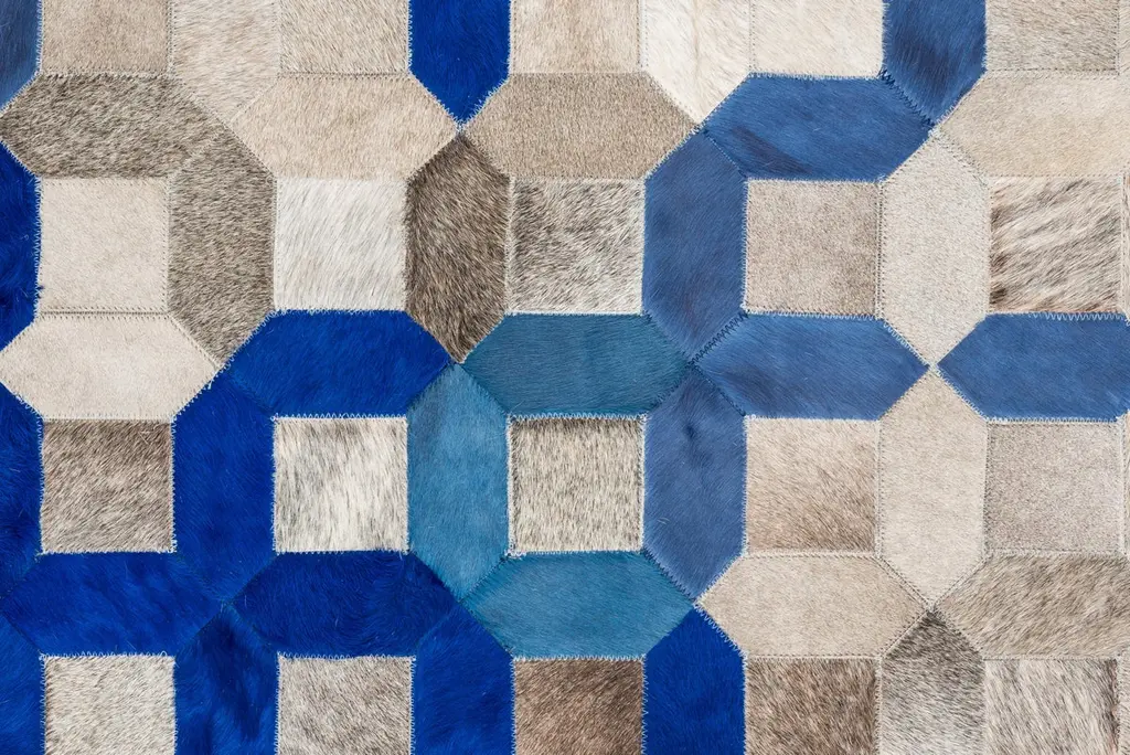 Crammed with color, this new release under our Alta line will add spades of charisma and sophistication to your interior. The blue is combined with natural grey shades to create a one of a kind look guaranteed to refresh and revive your interior!The Alta range combines smaller tiles and tessellation’s with pops of color in a combination that delivers on style but saves on price. Small measures 2 x 1.6m (6’7” x 5’3”). Large measures 2 x 3M (6’7” x 9’8”) and X-Large measures 2.75 x 3.65m (9' x 12')This item can easily be customized to any color size or shape upon request.Art Hide rugs are usually made to order. Please allow around 4-5 weeks for delivery.